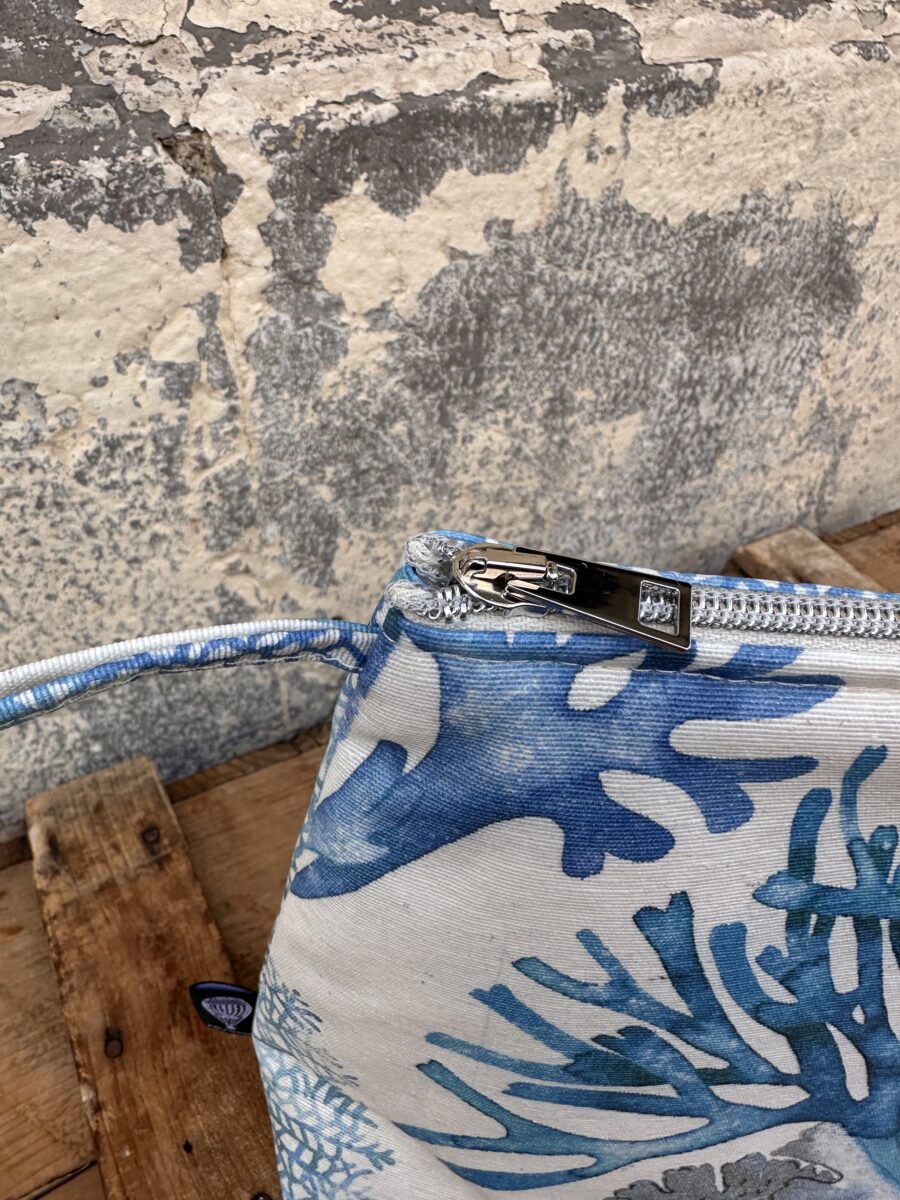 Il beauty case impermeabile Corallo Azzurro è un accessorio raffinato e funzionale, pensato per chi ama l’eleganza del mare e la comodità dei dettagli ben fatti. La fantasia, ispirata ai coralli dei fondali marini, trasmette serenità e freschezza, rendendo questo necessaire perfetto per ogni occasione, in città come in vacanza.