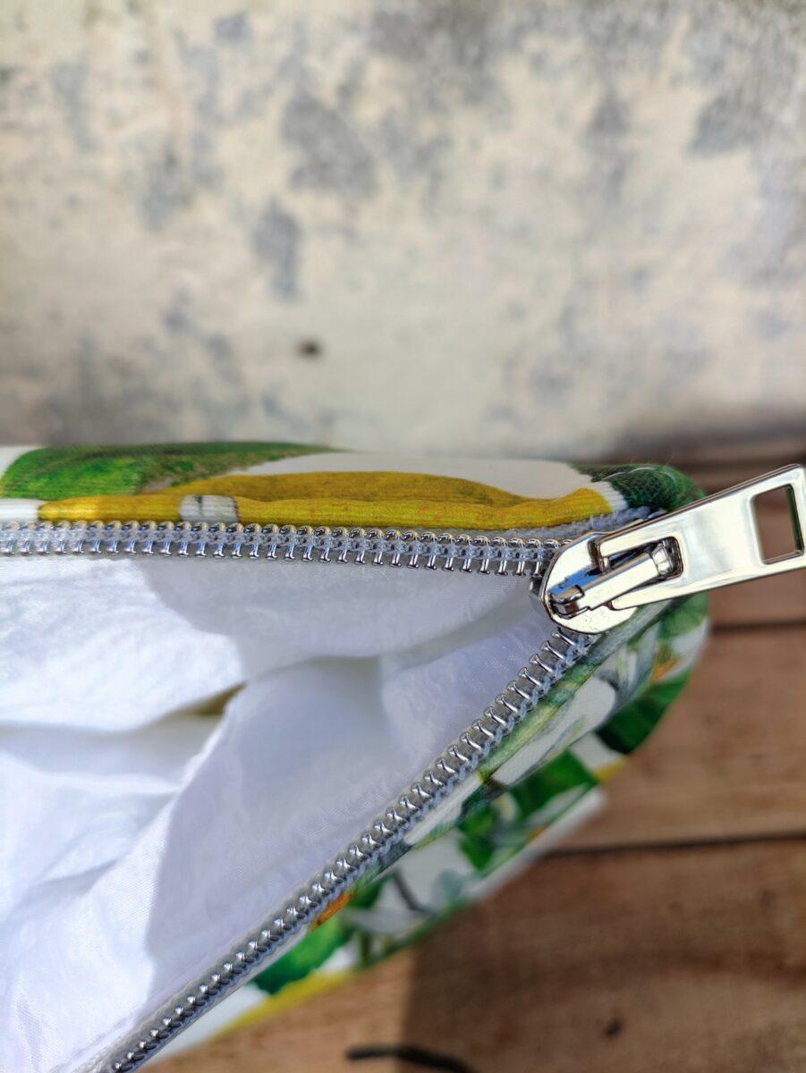 🍋 Realizzato in tessuto resinato impermeabile, è foderato internamente con un tessuto in tinta unita coordinata e rifinito con cura sartoriale. All’interno è presente una taschina comoda per riporre piccoli oggetti, mentre la cerniera decorativa assicura una chiusura sicura e un tocco di luminosità. Il tessuto antimacchia e lavabile rende questo beauty case resistente e ideale per l’uso quotidiano o per accompagnarti in viaggio.
