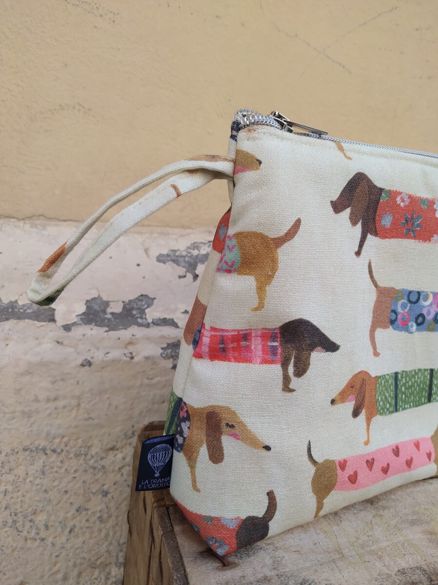 Il beauty case in tessuto Cani Bassotti è un accessorio simpatico e funzionale, ideale per chi ama unire praticità e ironia. Con la sua fantasia allegra e piena di personalità, è perfetto per accompagnarti in ogni momento della giornata, a casa o in viaggio, portando sempre con sé un sorriso.