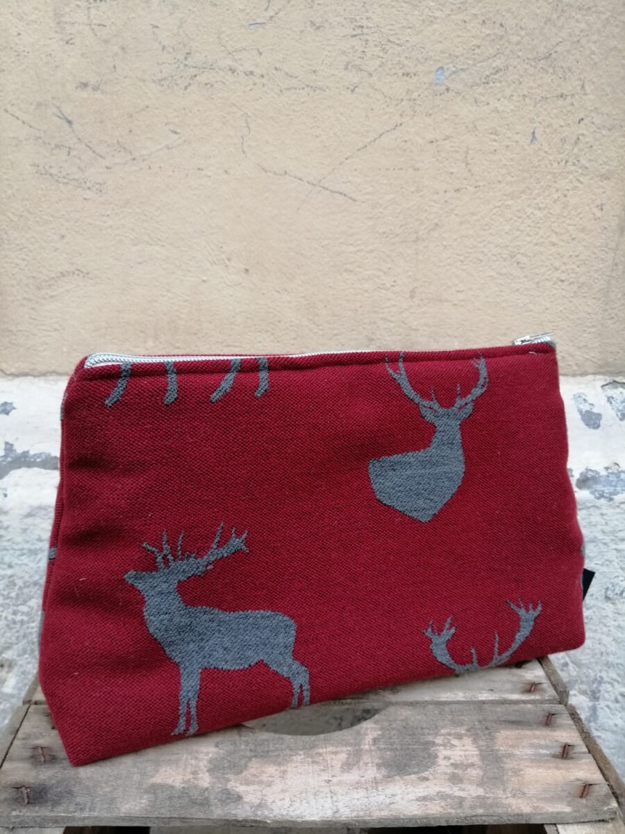 🦌 Realizzato in panno, è foderato internamente con un tessuto in tinta unita coordinata e rifinito con grande cura artigianale. Dispone di una taschina interna ideale per piccoli oggetti e di una cerniera decorativa che aggiunge un tocco raffinato. Il tessuto, lavabile e resistente, lo rende pratico e adatto a un uso quotidiano o a essere portato in viaggio, garantendo ordine e comfort in ogni occasione.