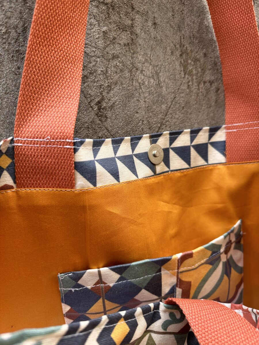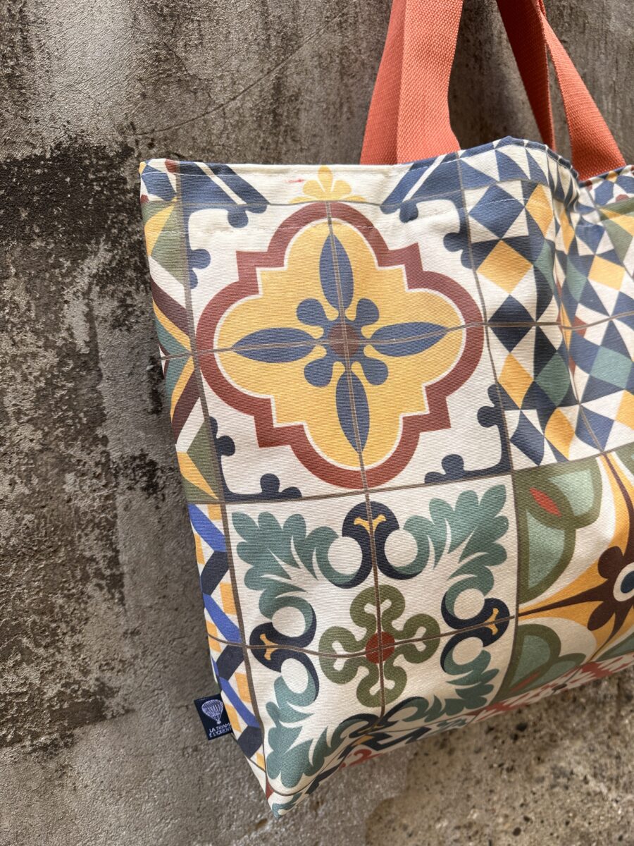 Realizzata in tessuto di cotone resinato impermeabile, unisce la bellezza delle tradizionali decorazioni a maiolica con la praticità di un materiale resistente all’acqua e facile da pulire. Ideale per l’utilizzo quotidiano, per il tempo libero, lo shopping o come borsa mare.