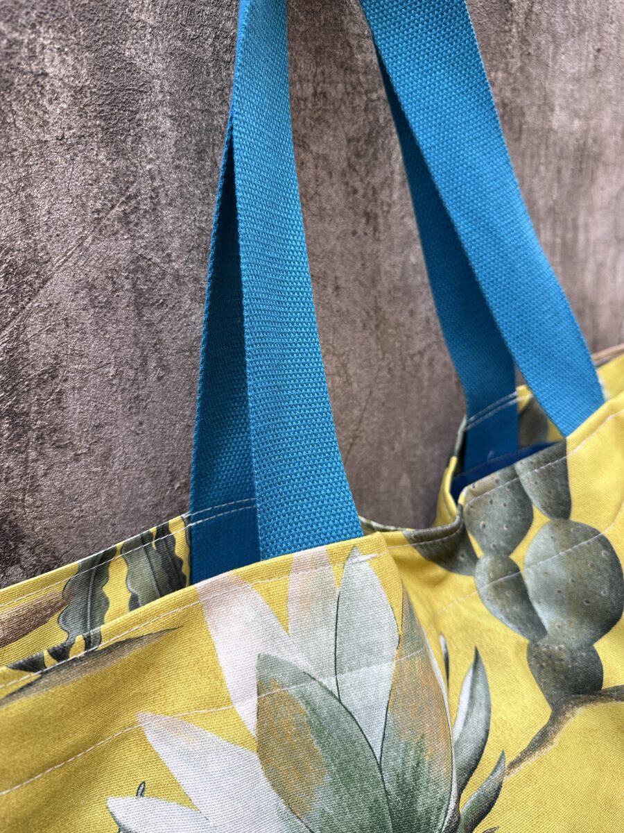 Realizzata in cotone stampato con fantasia cactus, la borsa è foderata in raso di cotone in tinta unita coordinata, con un’ampia tasca interna nello stesso tessuto esterno, ideale per organizzare gli oggetti personali. La chiusura con bottone calamitato garantisce praticità e sicurezza, mentre i due manici in nastro colorato aggiungono un dettaglio vivace e moderno.