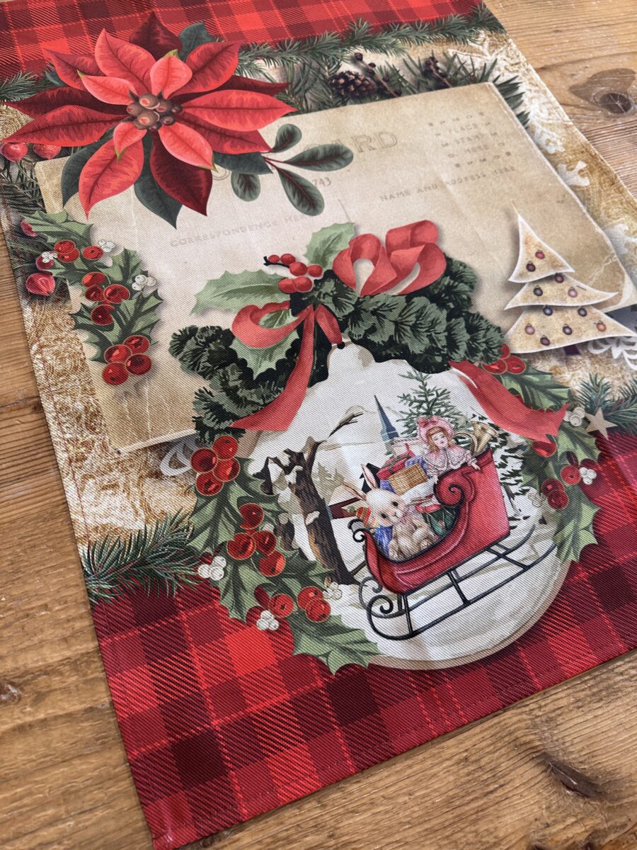 Il fondo scozzese rosso si arricchisce di dettagli natalizi: una grande stella di Natale, rami di abete e bacche di agrifoglio incorniciano una suggestiva scena invernale.