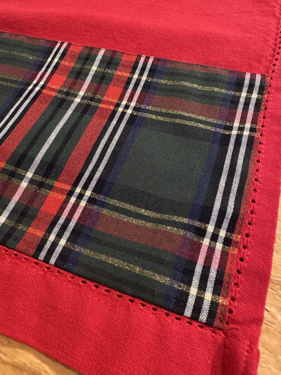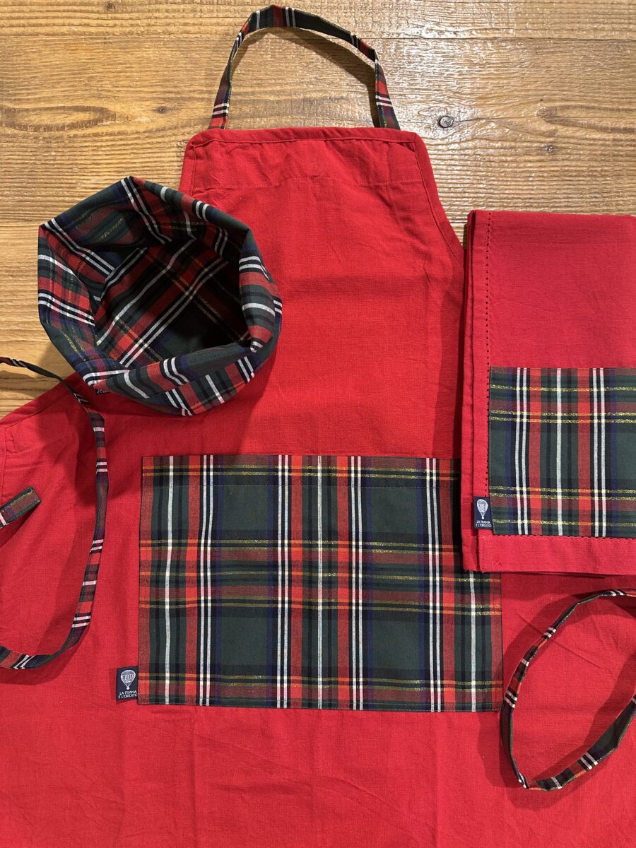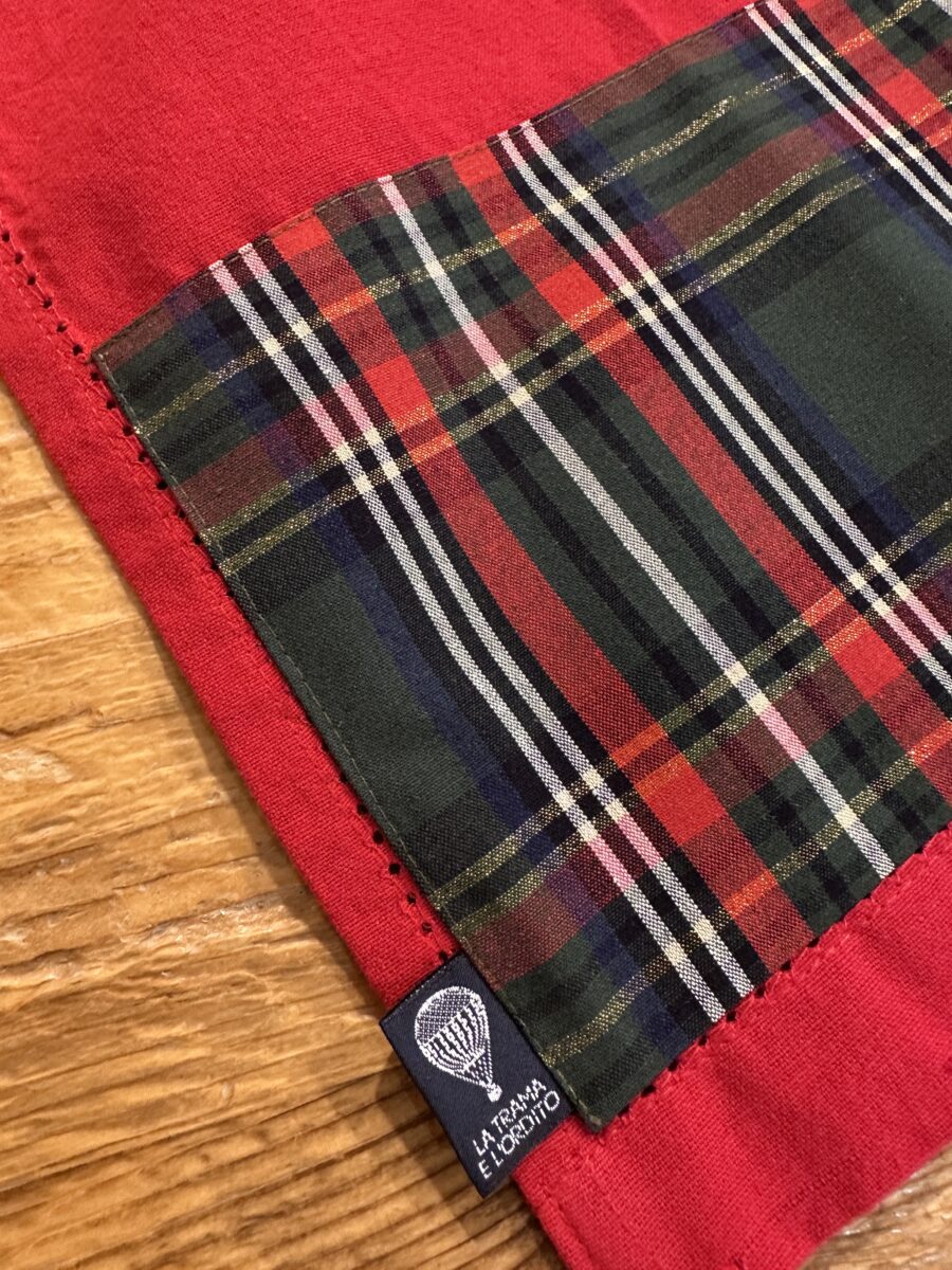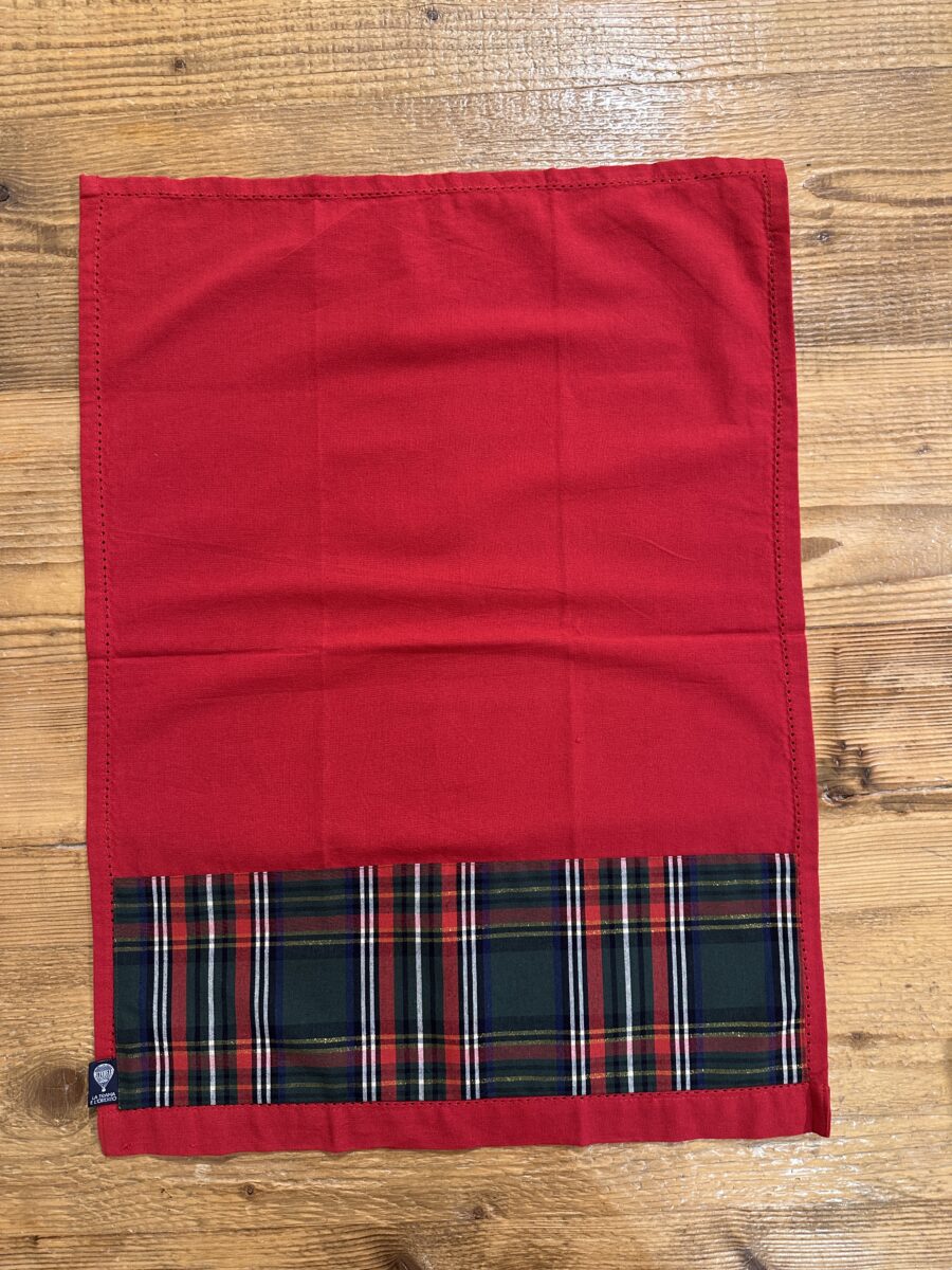 La base è in tinta unita rossa ed è decorato con una banda in tessuto tartan. Il suo disegno classico nei toni del rosso e verde, con intrecci dorati appena accennati, richiama l’atmosfera calda delle feste e lo stile delle case di montagna. È perfetto per chi ama un tocco tradizionale ma curato, adatto a ogni tipo di cucina — rustica, moderna o country.