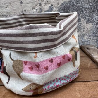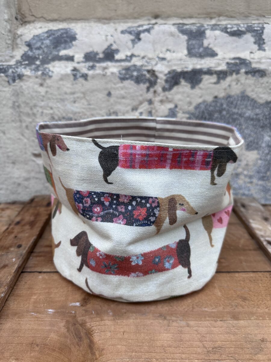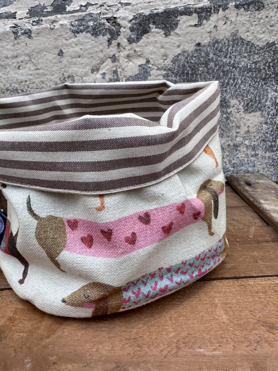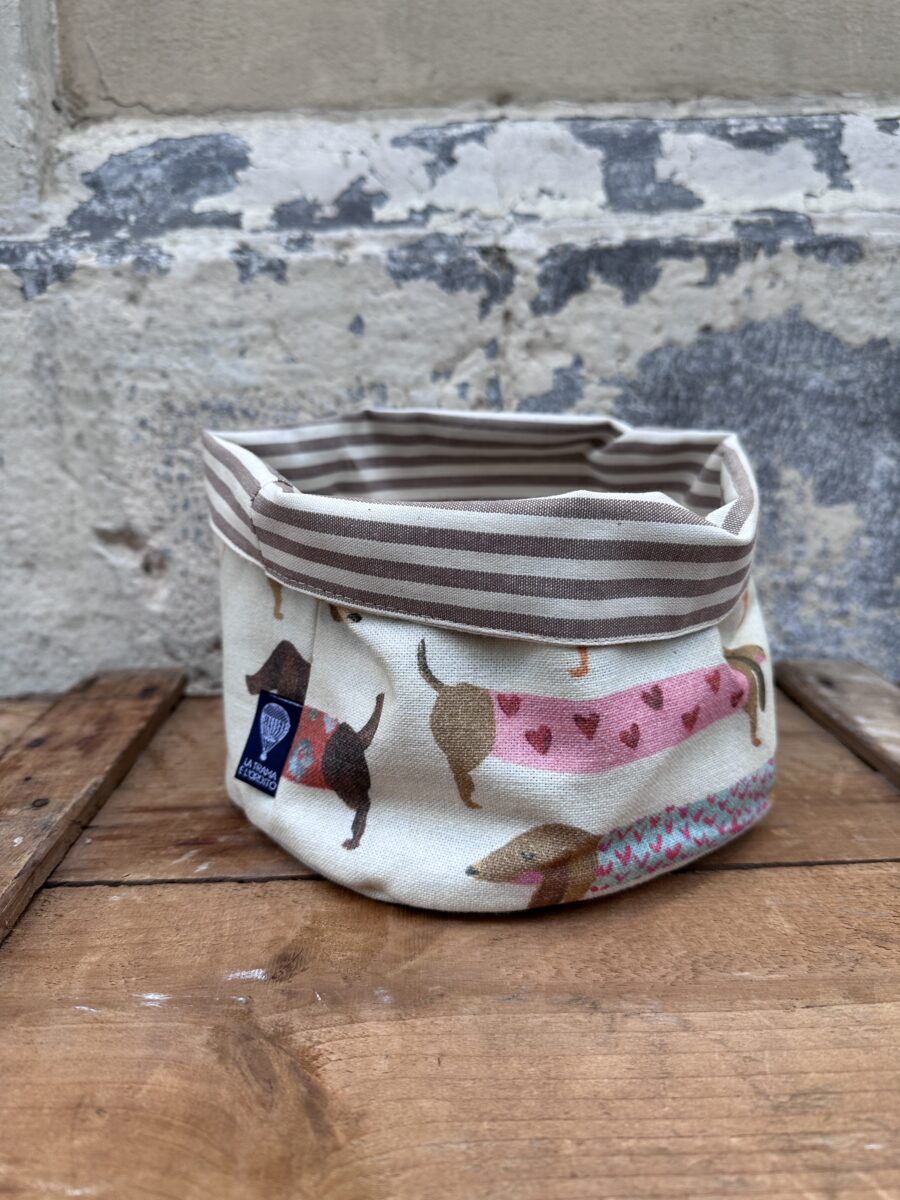 Cestino in Tessuto Cani Bassotti – Scopri la versatilità dei nostri cestini artigianali! Perfetti per servire il pane in tavola o come originali svuota tasche, questi cestini aggiungeranno un tocco di allegria e stile a qualsiasi ambiente della tua casa.