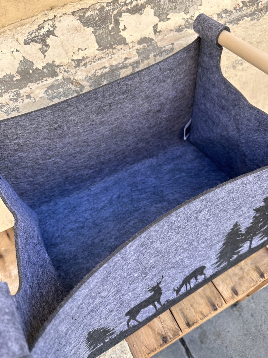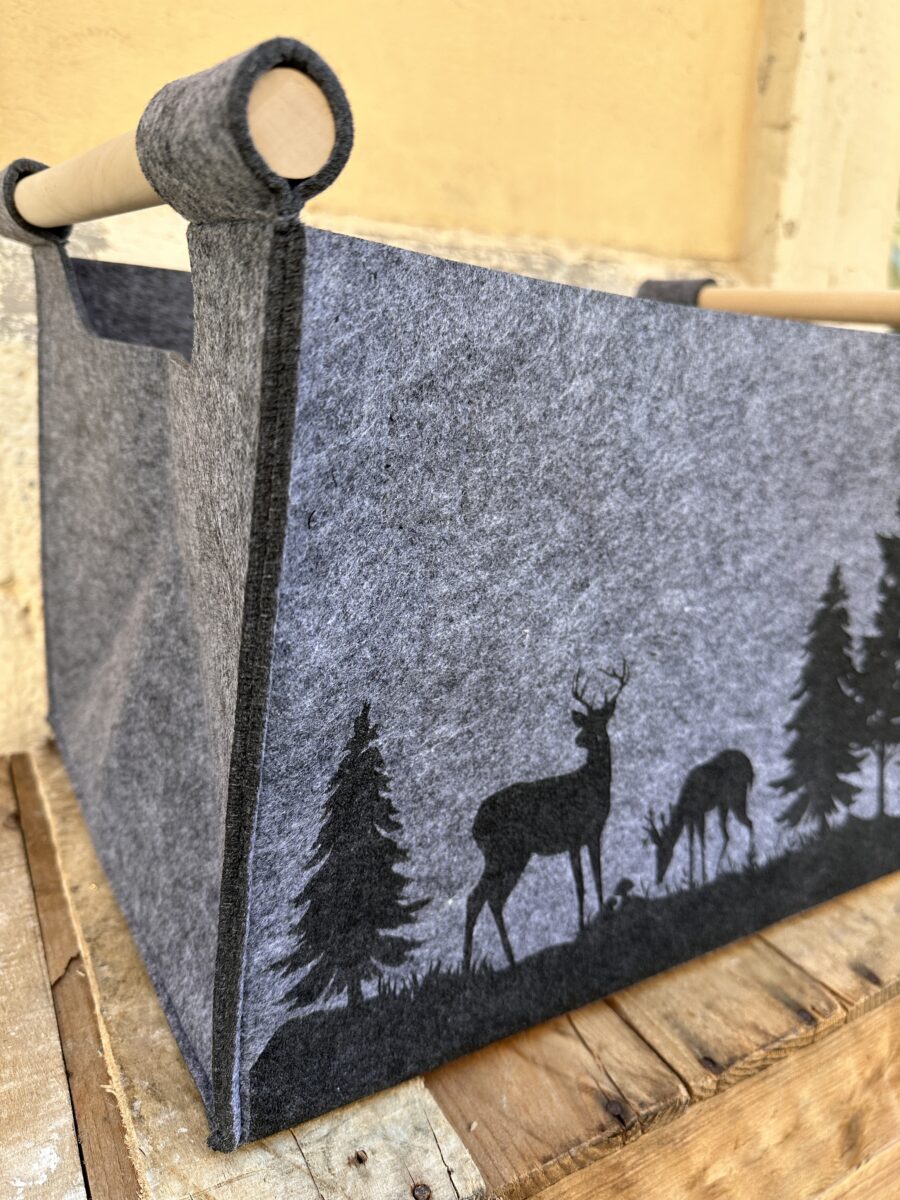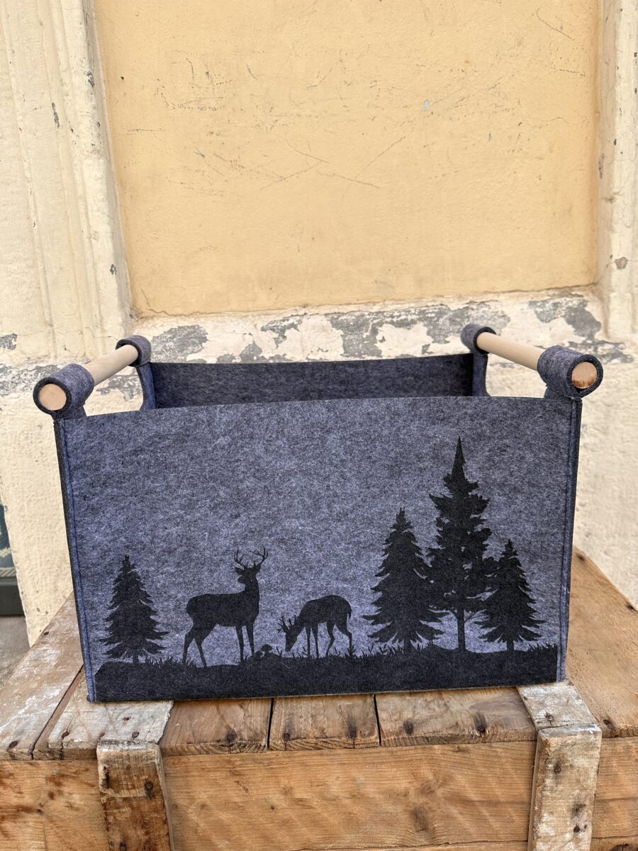 Il feltro di alta qualità dona a ogni cesto una texture morbida e accogliente, capace di integrarsi con naturalezza sia in ambienti moderni che in atmosfere più rustiche o di montagna. I motivi stampati o applicati – che variano a seconda del modello – rendono ogni pezzo decorativo e distintivo, ideale per completare l’arredamento con un dettaglio sobrio ma ricercato.