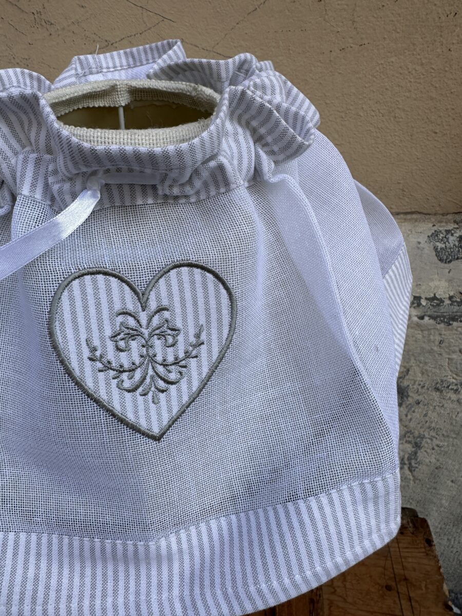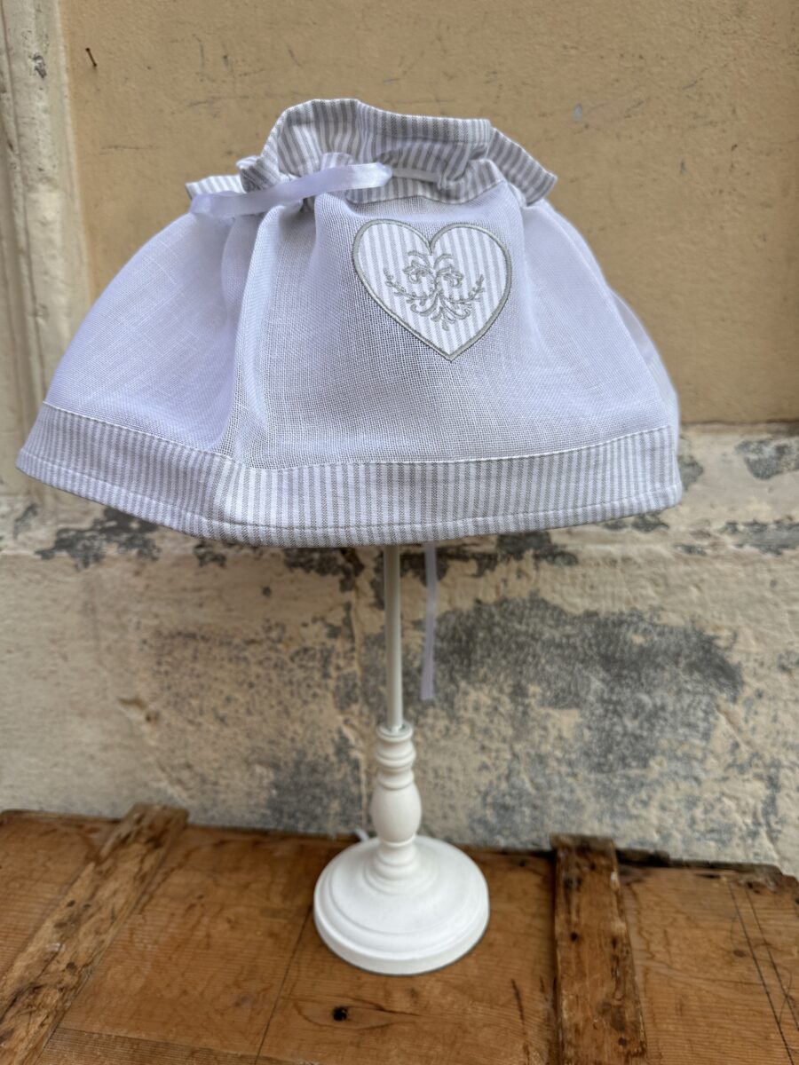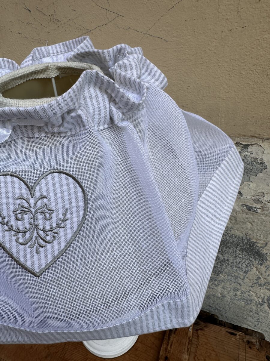 Questo copri paralume con cuore ricamato stile shabby chic è pensato per rinnovare facilmente l’aspetto di una lampada da tavolo o di una abat-jour, senza sostituire il paralume originale.