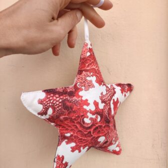 Decorazione Stella Corallina – Queste decorazioni in tessuto nascono nel nostro laboratorio come piccoli oggetti pensati per arricchire la casa con semplicità e personalità. Ogni pezzo viene realizzato partendo dai nostri tessuti, selezionati per i disegni, i colori e la qualità della stampa. Le sagome vengono ritagliate una a una e successivamente imbottite di ovatta, dando vita a decorazioni leggere ma curate nei dettagli.