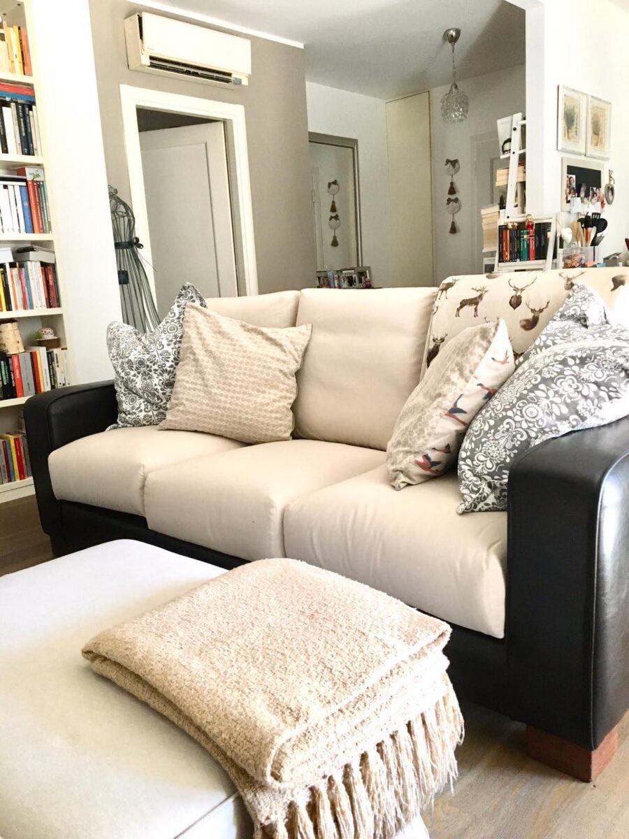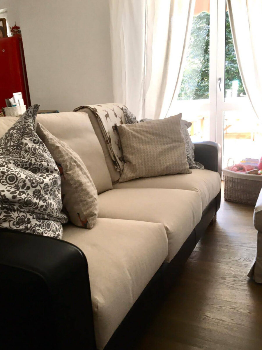 La scelta del tessuto è stata fondamentale. Abbiamo optato per un tessuto in tinta unita di colore neutro, capace di creare un contrasto elegante con la scocca in ecopelle, senza rompere l’armonia dell’ambiente. I toni caldi e delicati del rivestimento dialogano con quelli della stanza, dando al divano un aspetto rinnovato ma coerente.