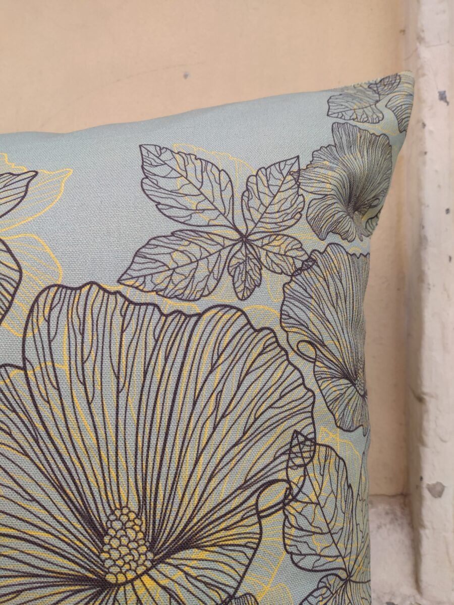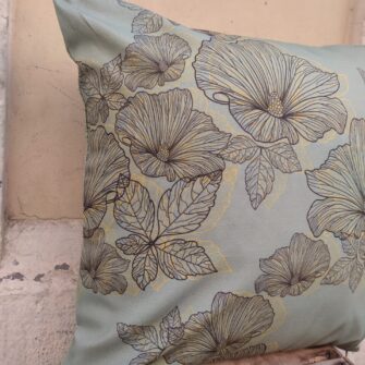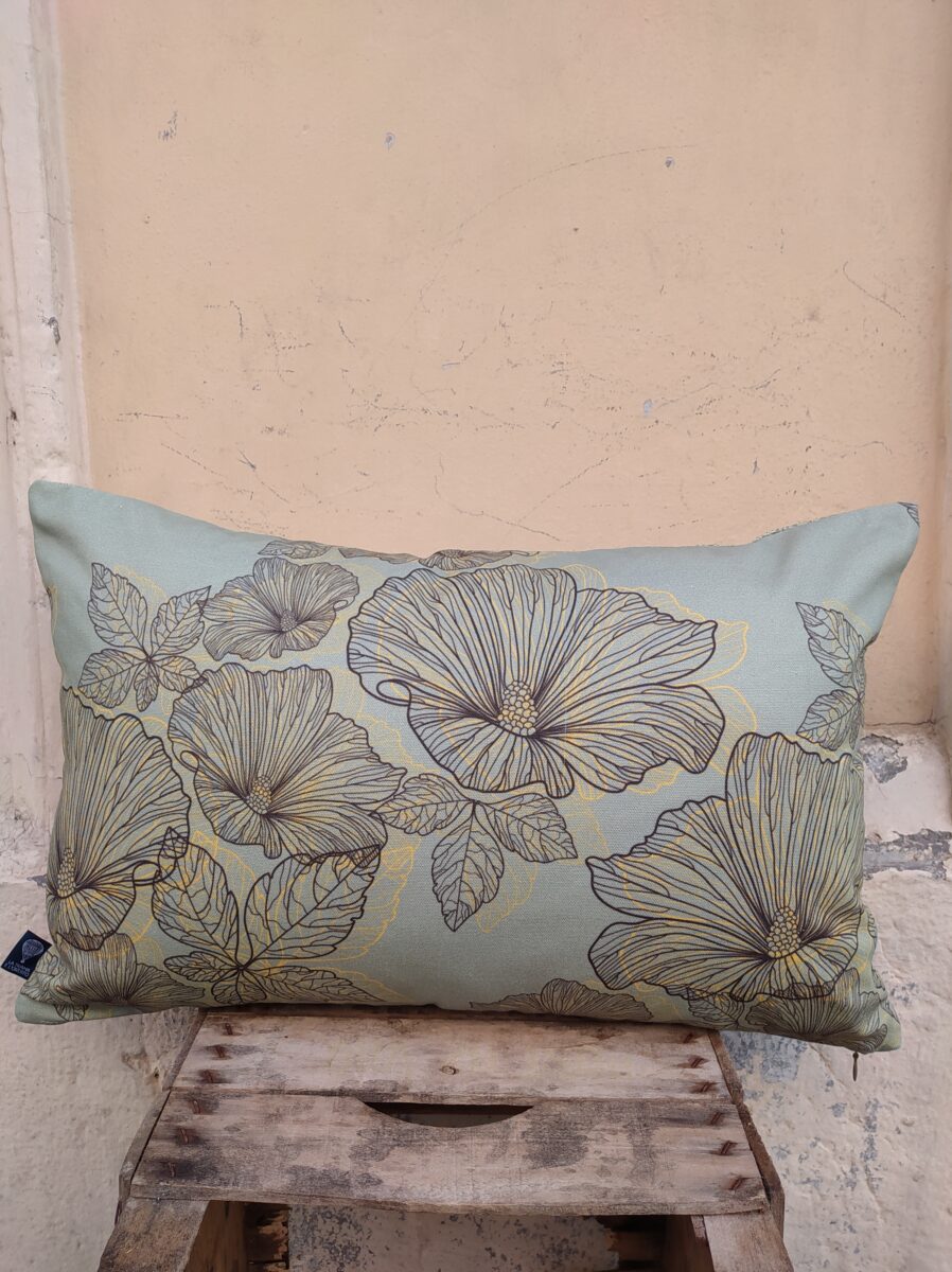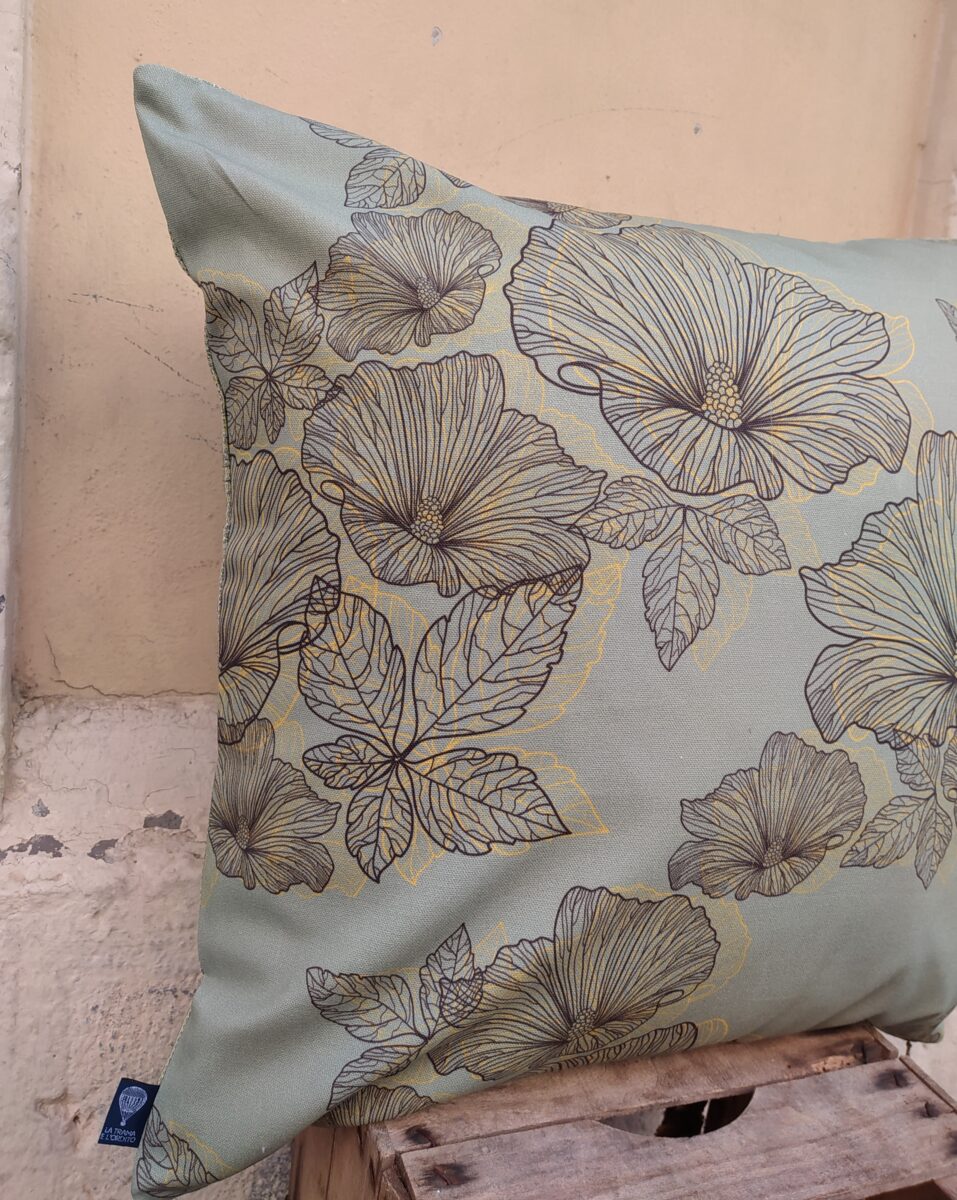 Federa Copricuscino Fiori Salvia – Anche per un disegno apparentemente così semplice abbiamo utilizzato la stampa digitale, che dona una profondità incredibile a questi fiori stilizzati. La base color salvia fa da sfondo alle foglie e ai petali monocromatici, tratteggiati con leggeri toni ocra. Bellissimo da solo o in coordinato con altri tessuti della collezione.