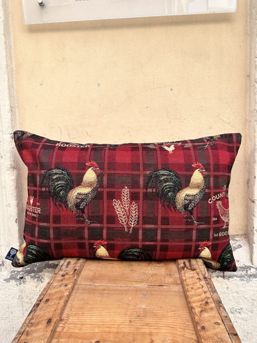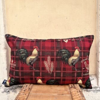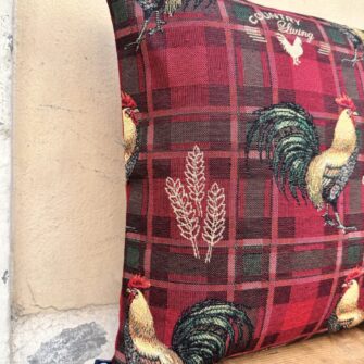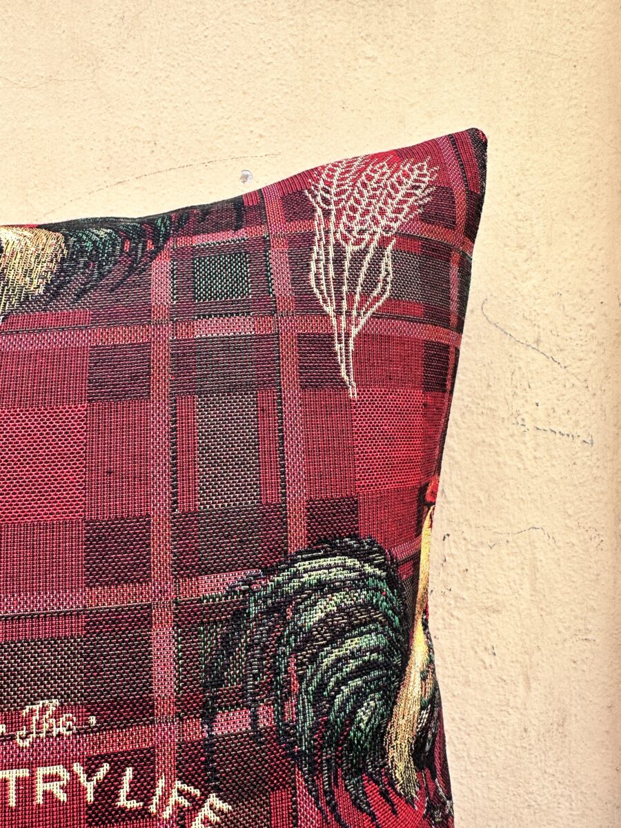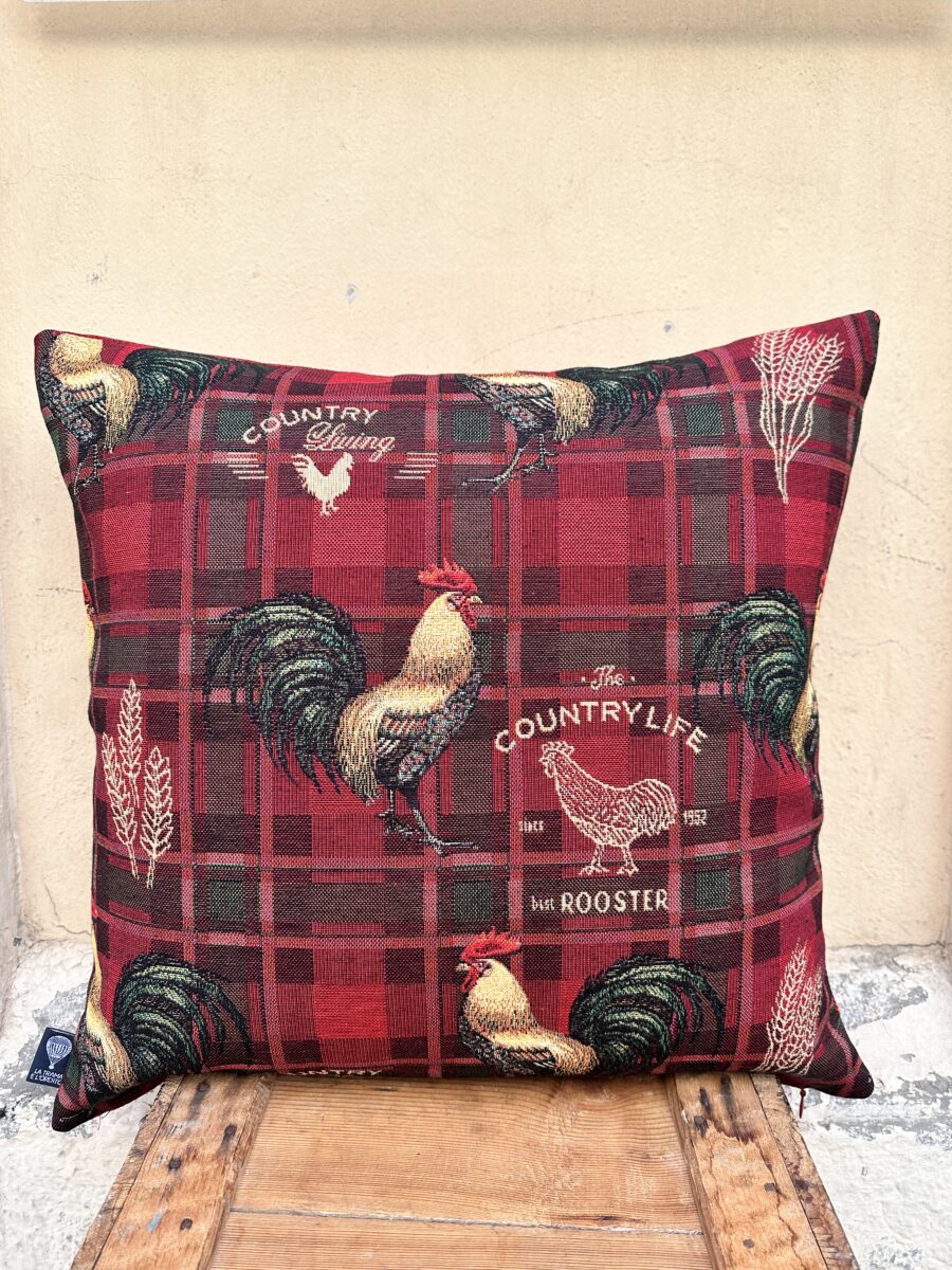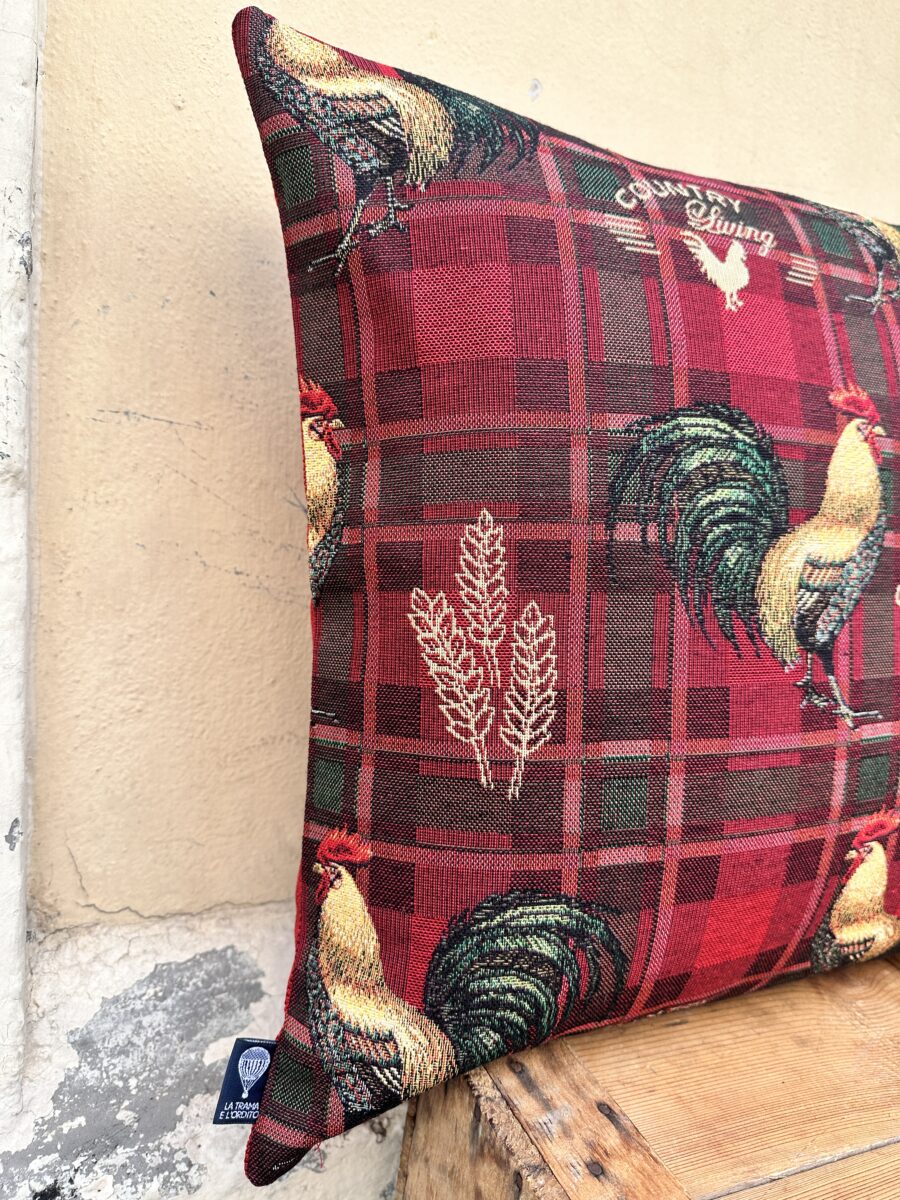 Federa Copricuscino Galli Rooster – Uno splendido tessuto Jacquard colorato, robusto e resistente. Tanti galli dal piumaggio dorato su un bel fondo scozzese, nei colori rosso scuro e verde. Il disegno è un classico dello stile country chic.
