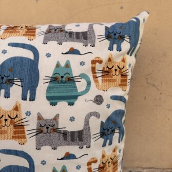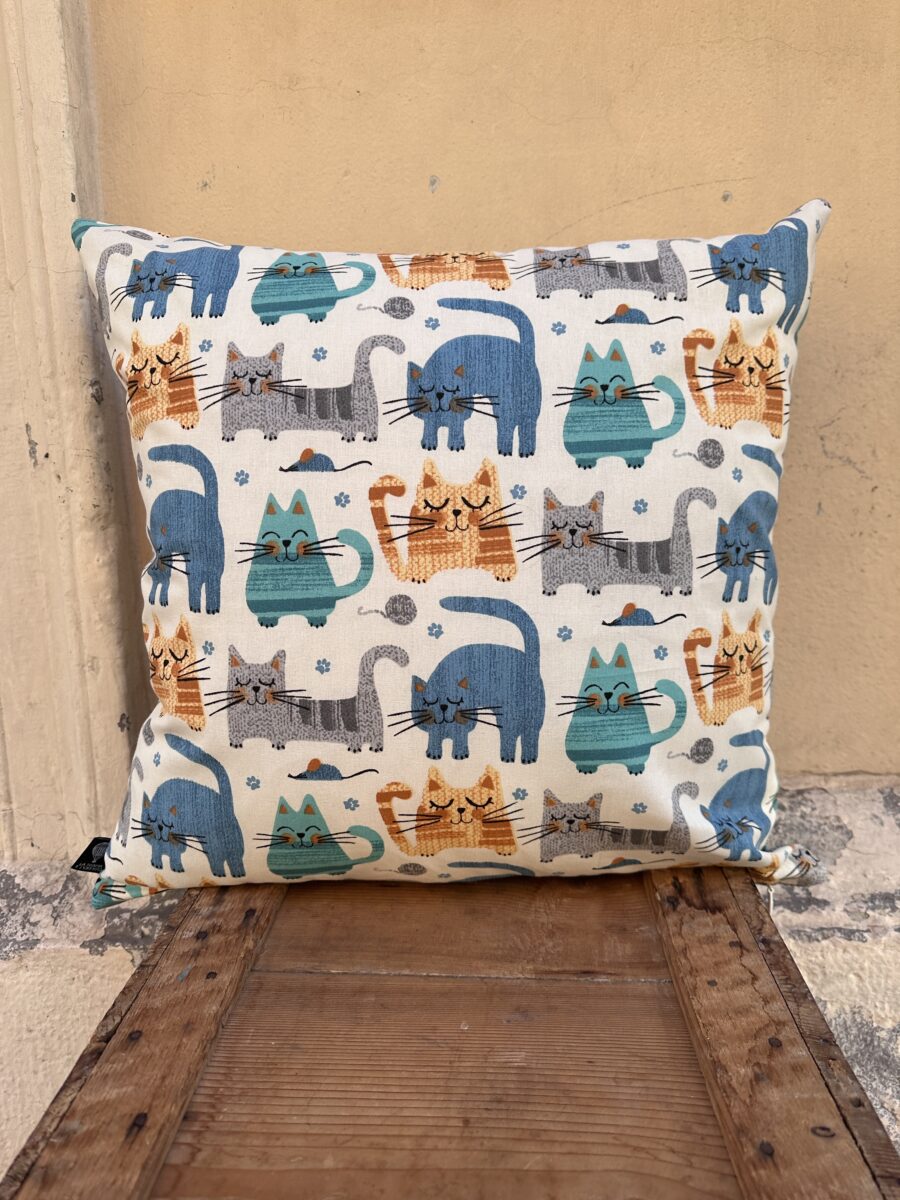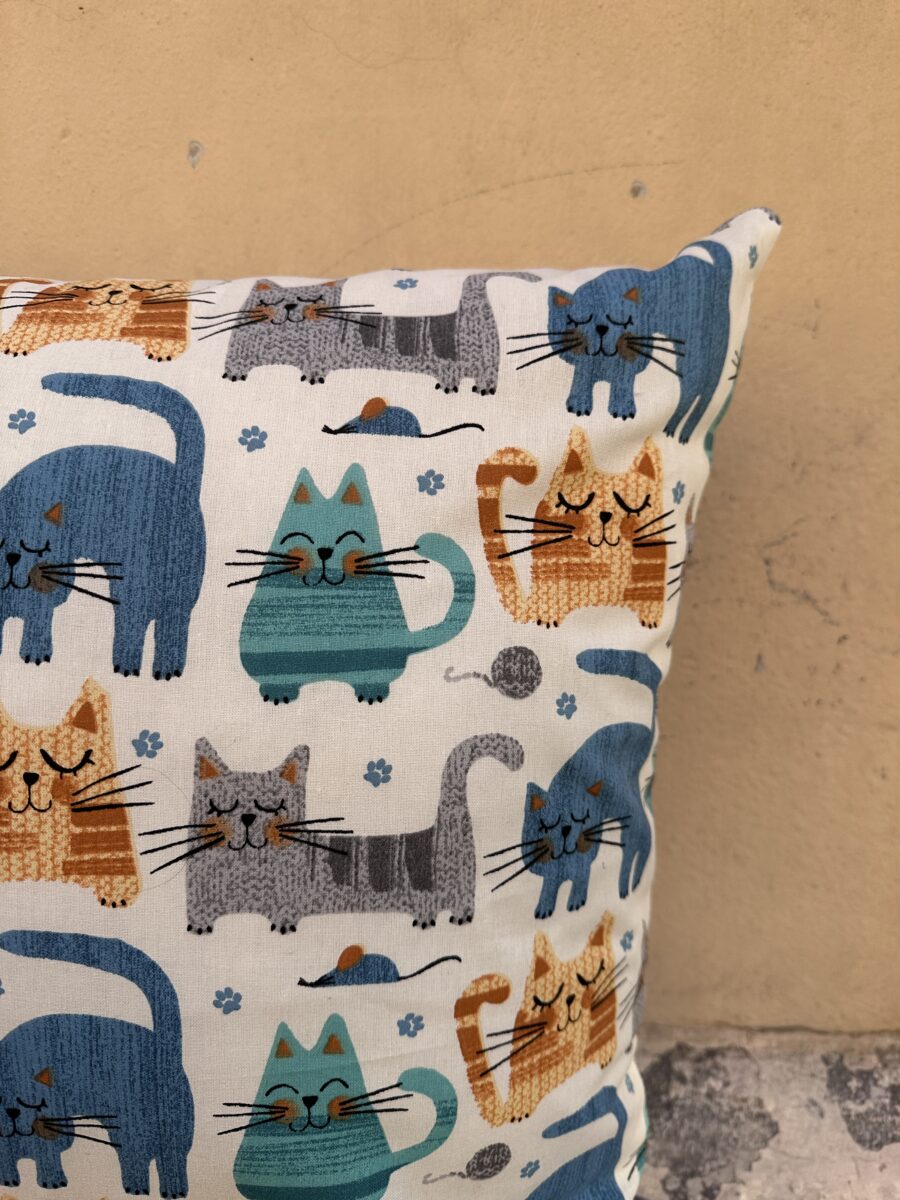 La Federa Copricuscino Gatti Azzurri è pensata per chi ama portare in casa un tocco di colore, simpatia e leggerezza. Il tessuto presenta una fantasia vivace ricca di gatti stilizzati nelle tonalità dell’azzurro, del senape e del grigio. Inoltre, i piccoli dettagli – come le zampette, i gomitoli e i topolini – aggiungono un carattere giocoso alla composizione. Il fondo chiaro mette in risalto ogni soggetto e dona luminosità all’ambiente. Di conseguenza, la federa è perfetta per ravvivare divani, poltrone e letti con una nota allegra e informale.