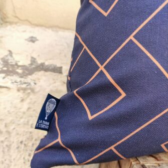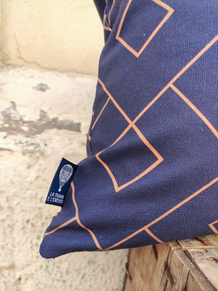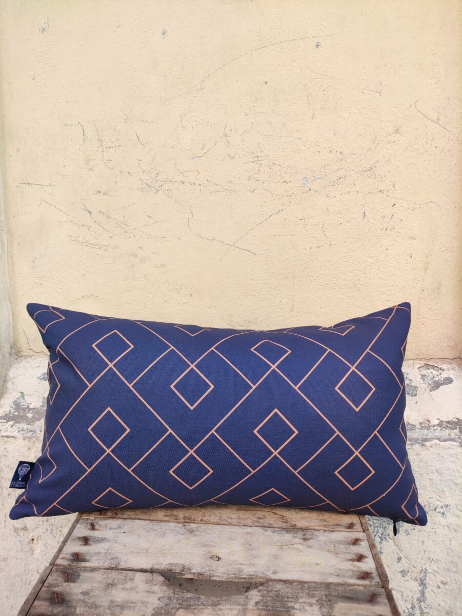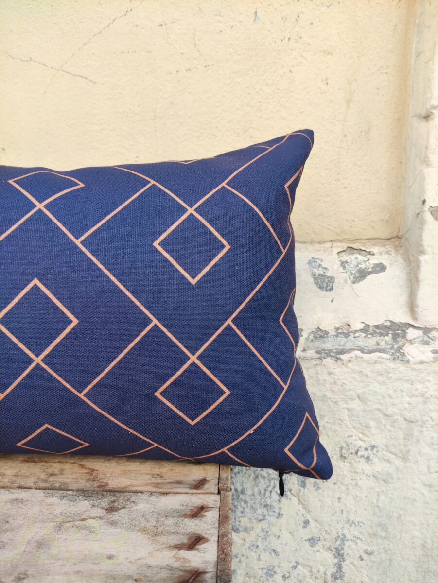 Federa Copricuscino Geometrico Blu – Tessuto stampato su base di cotone in grande altezza. Una linea geometrica percorre il fondo in tinta unita, per interrompere la serietà del blu scuro e donargli luminosità.