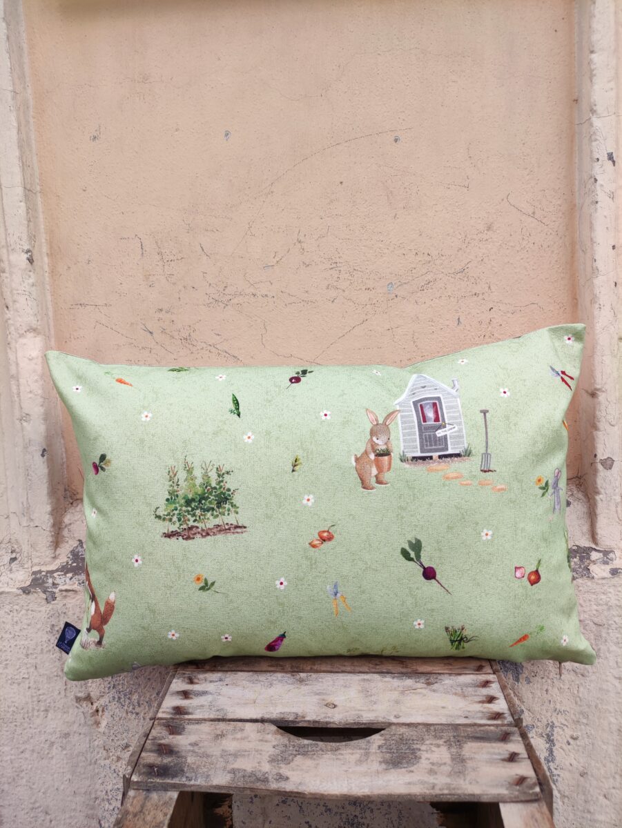Federa Copricuscino Mister Rabbit Giardino – Tanti piccoli amici indaffarati nel loro giardino stampati su questo morbido e bellissimo cotone. Mister Rabbit insieme con i suoi amici topolini preparano il loro orto con volpi, scoiattoli e tenere talpe.