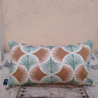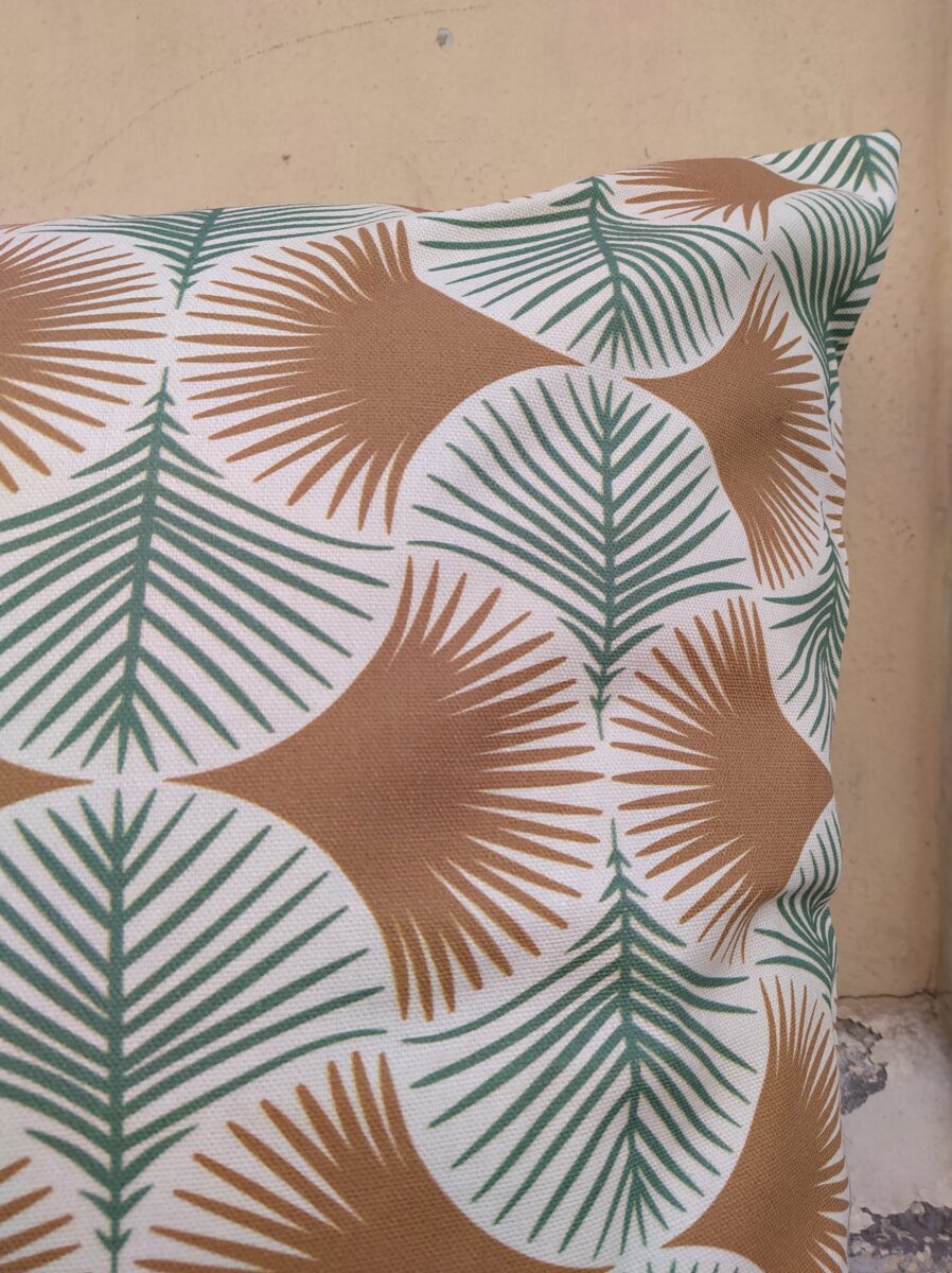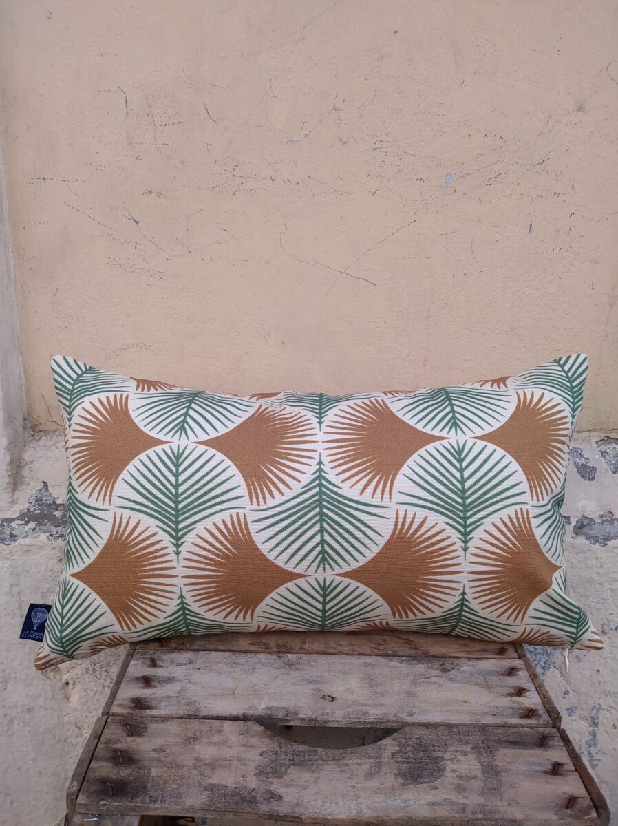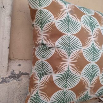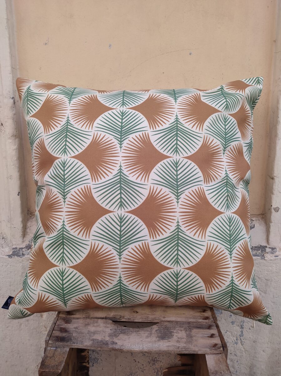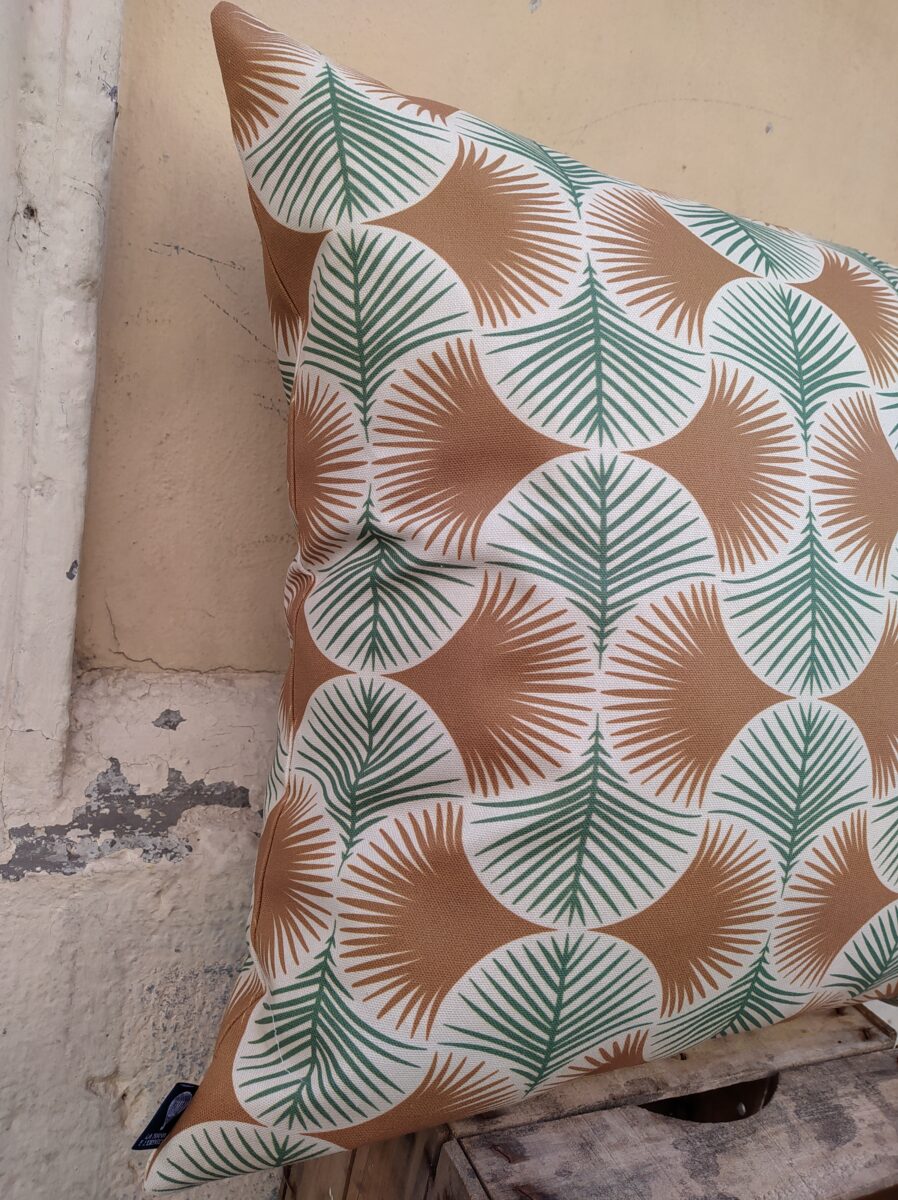 Federa Copricuscino Petali Déco – Una splendida rivisitazione dello stile déco per questo tessuto stampato nei toni ocra e verdi. Con questi cuscini decorativi possiamo creare splendidi coordinati.