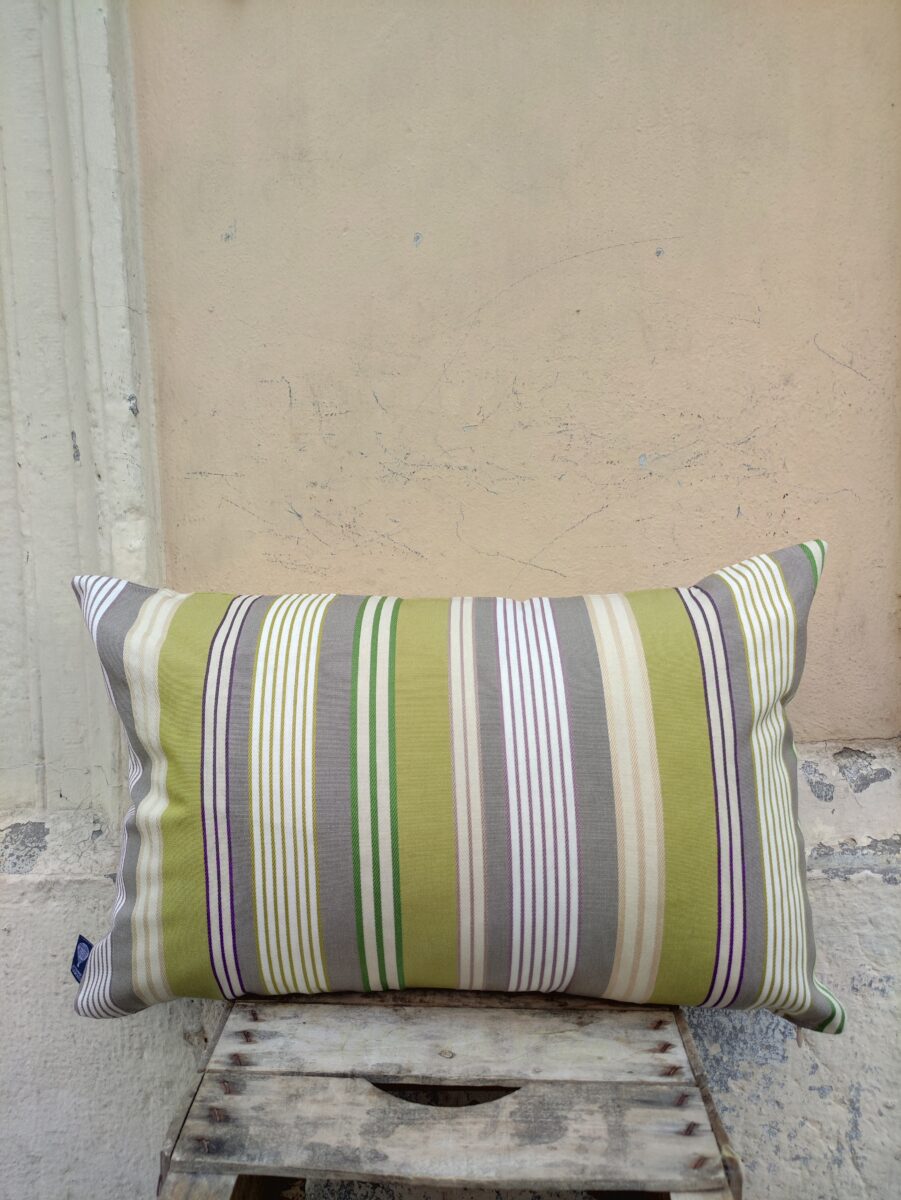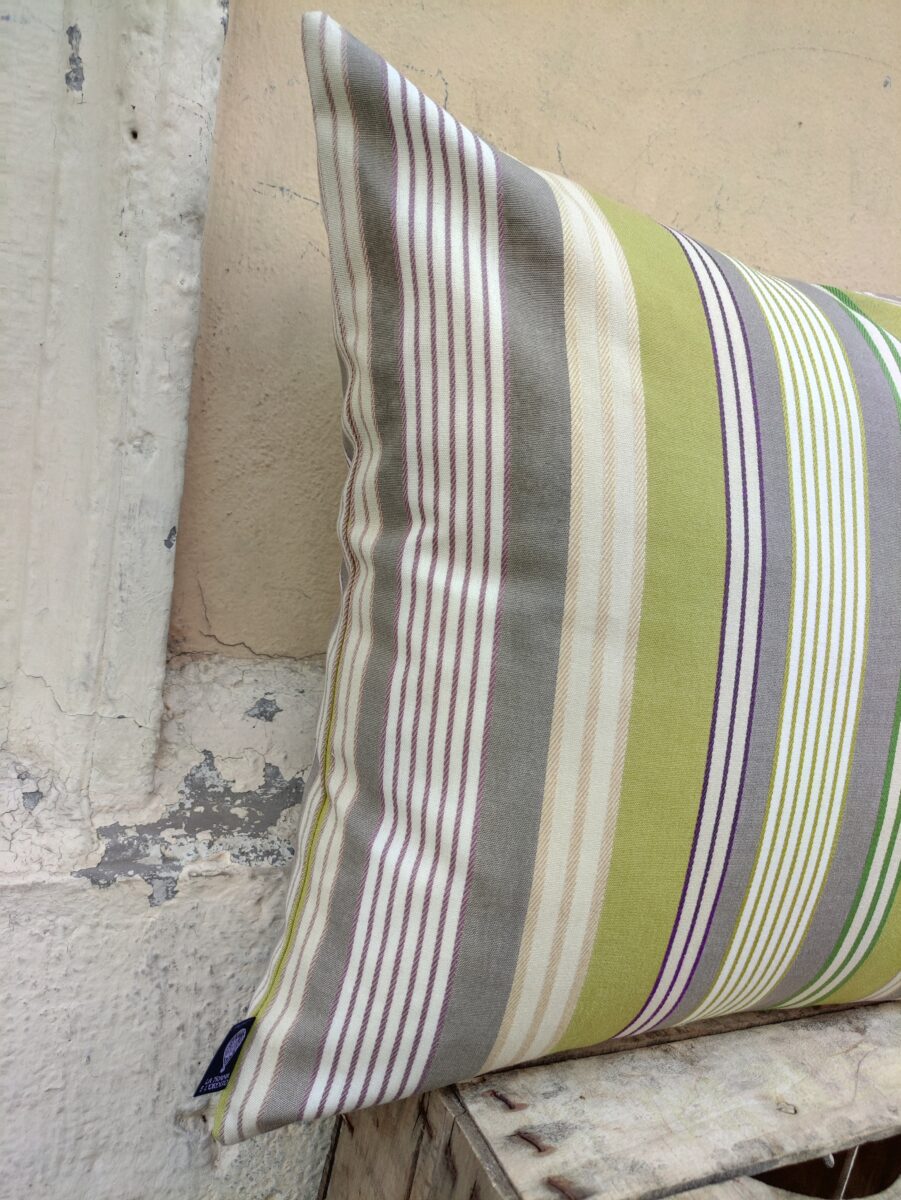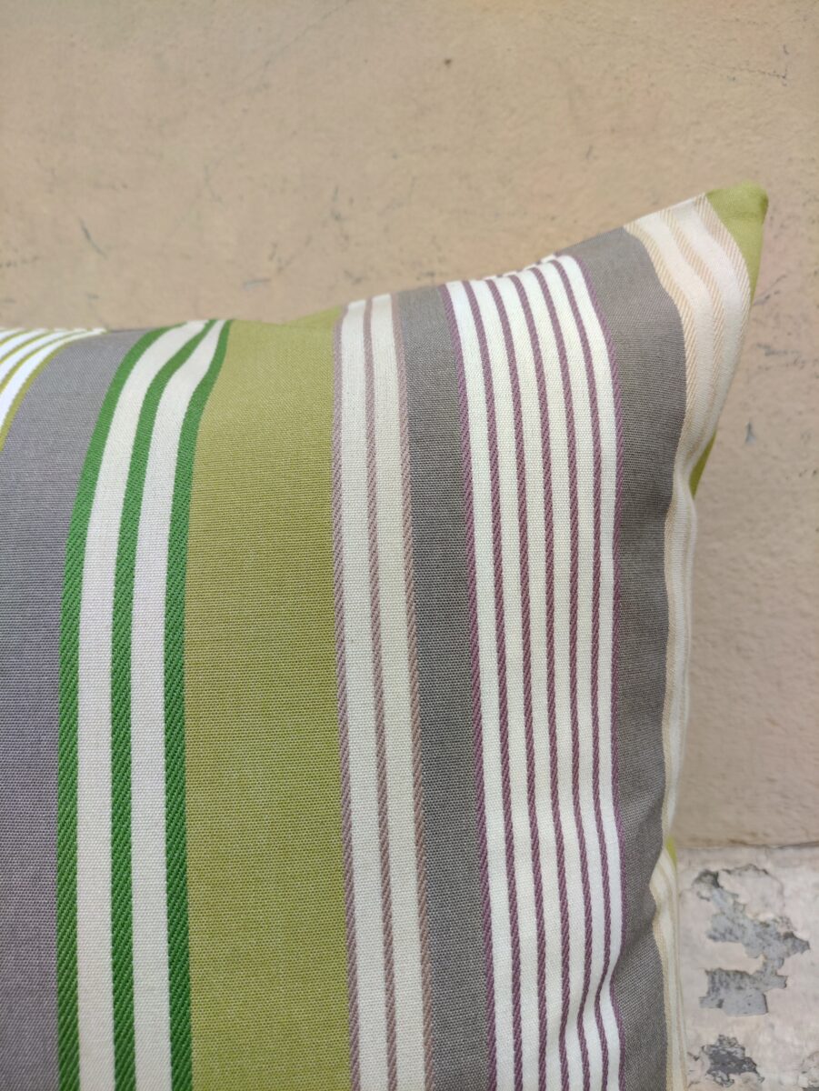 Federa Copricuscino Riga Verde – Tante righe, tutte diverse, che consentono a questo cuscino di inserirsi in qualunque arredamento. Da solo o coordinato con altri della nostra collezione. Possiamo utilizzarlo anche per esterni, perché tecnicamente studiato per resistere alla luce e alle muffe. Via libera alla fantasia, quindi.