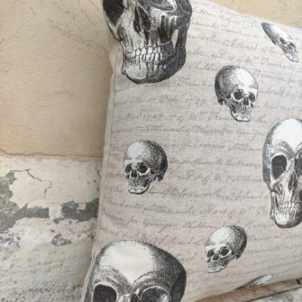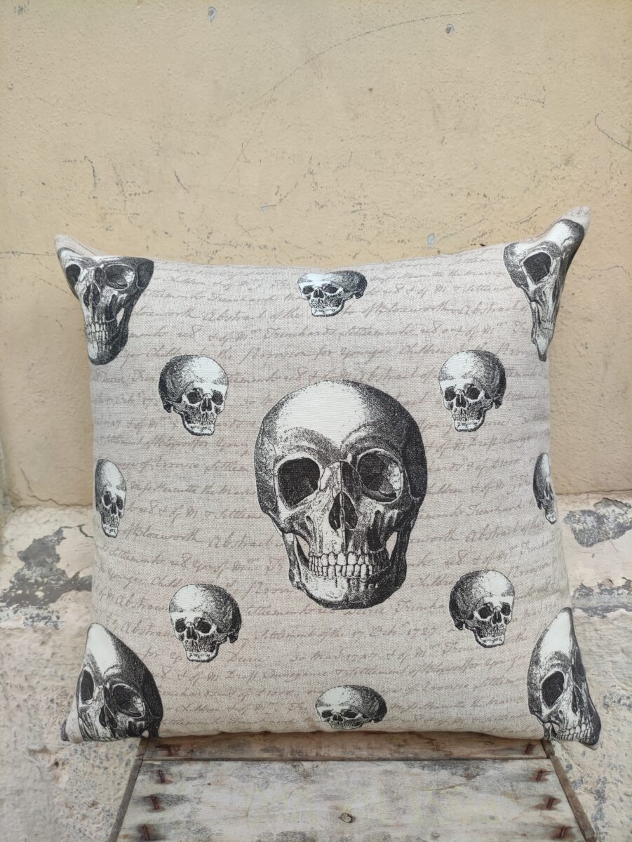 Federa Copricuscino Teschi – Ci sono tanti tessuti con i teschi in giro ma noi abbiamo scelto questo per la sua incredibile classe. Il fondo color tortora con scritte in corsivo, fitte fitte, gli rende un aspetto molto romantico. Le sfumature di questa stampa digitale sono perfette nel declinare tutti i toni dei grigi.