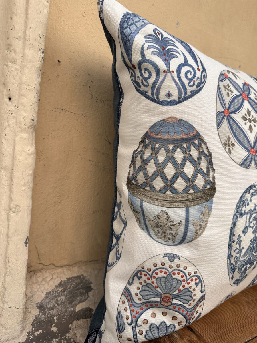 Federa Copricuscino Uova Imperiali – Una stampa fresca e raffinata per tante uova stile Fabergé blu su fondo bianco.