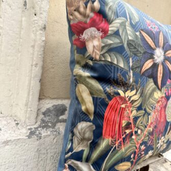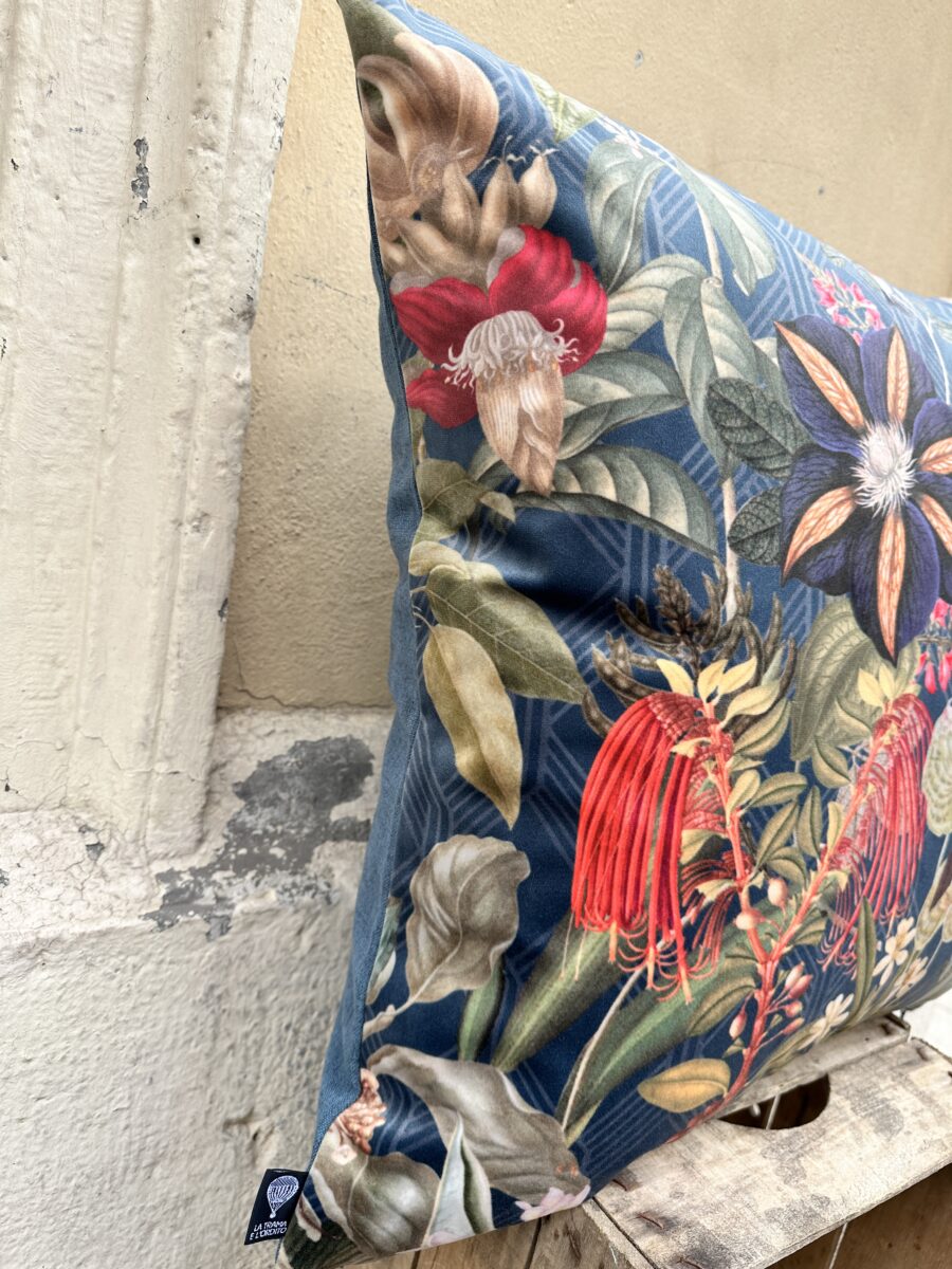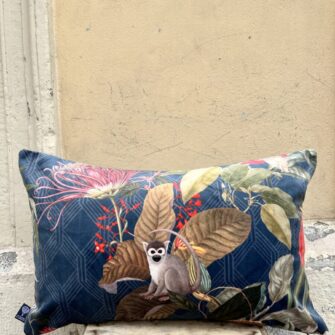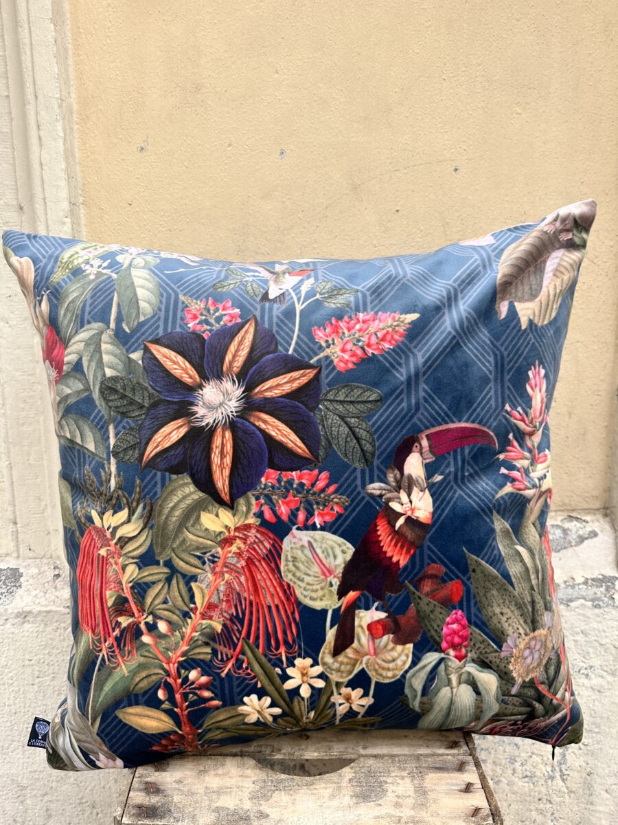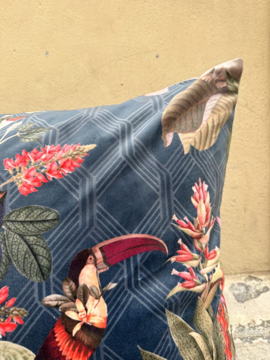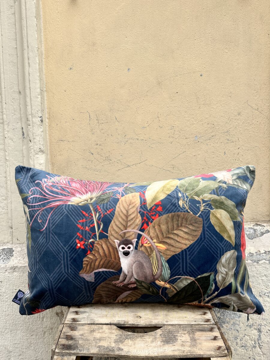 Federa Copricuscino Velluto Colibrì – Splendida stampa fotografica per le scimmiette, i colibrì e le rigogliose piante della giungla. La base è in velluto che sembra di cotone e i colori vividi e brillanti risaltano sul suo sfondo blu ottanio.