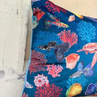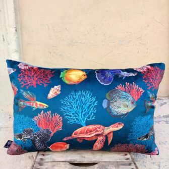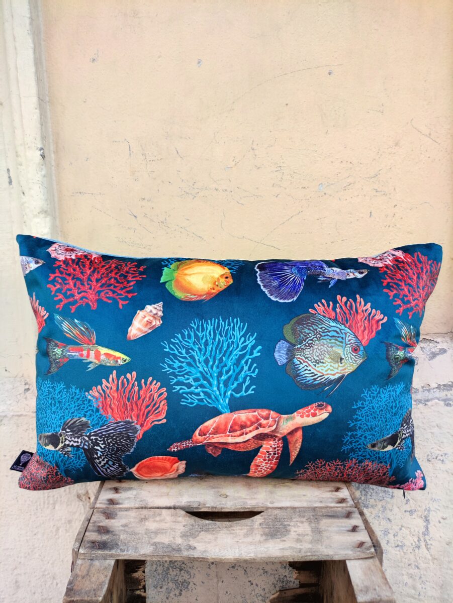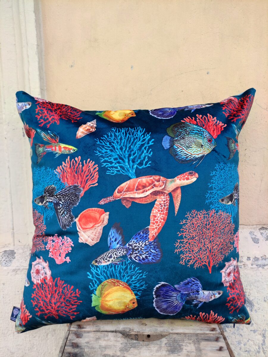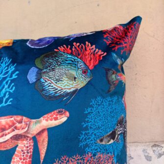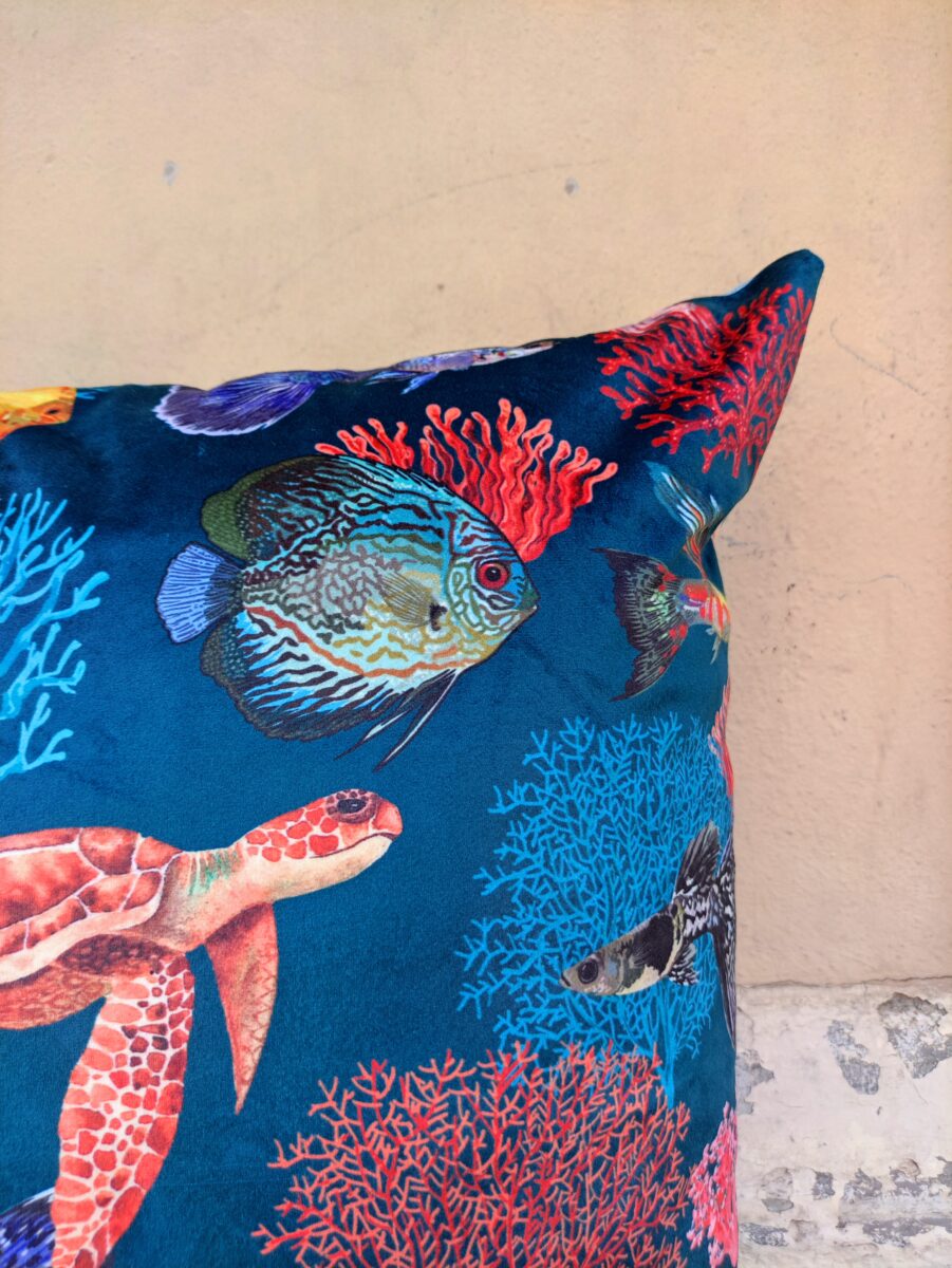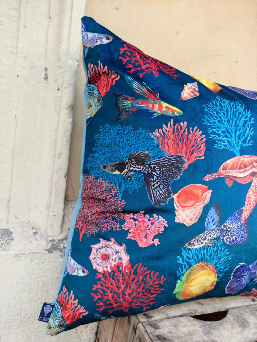 Federa Copricuscino Velluto Mare – Un mare pieno di coralli e di pesci per un raffinato velluto stampato. La vivacità dei colori risalta proprio perché abbiamo scelto una base in microfibra dall’effetto vellutato. Un elegante complemento estivo per un appartamento in città o la decorazione perfetta per una bella casa al mare.