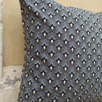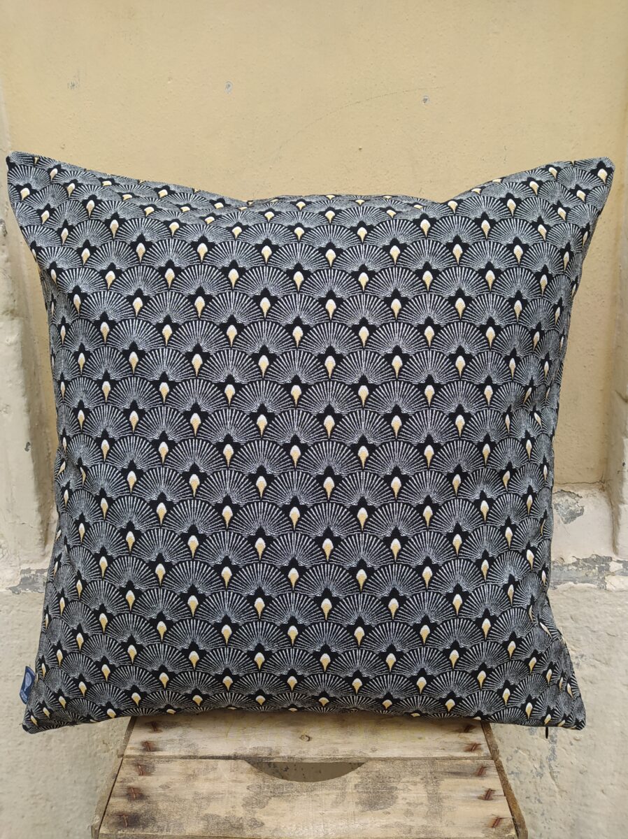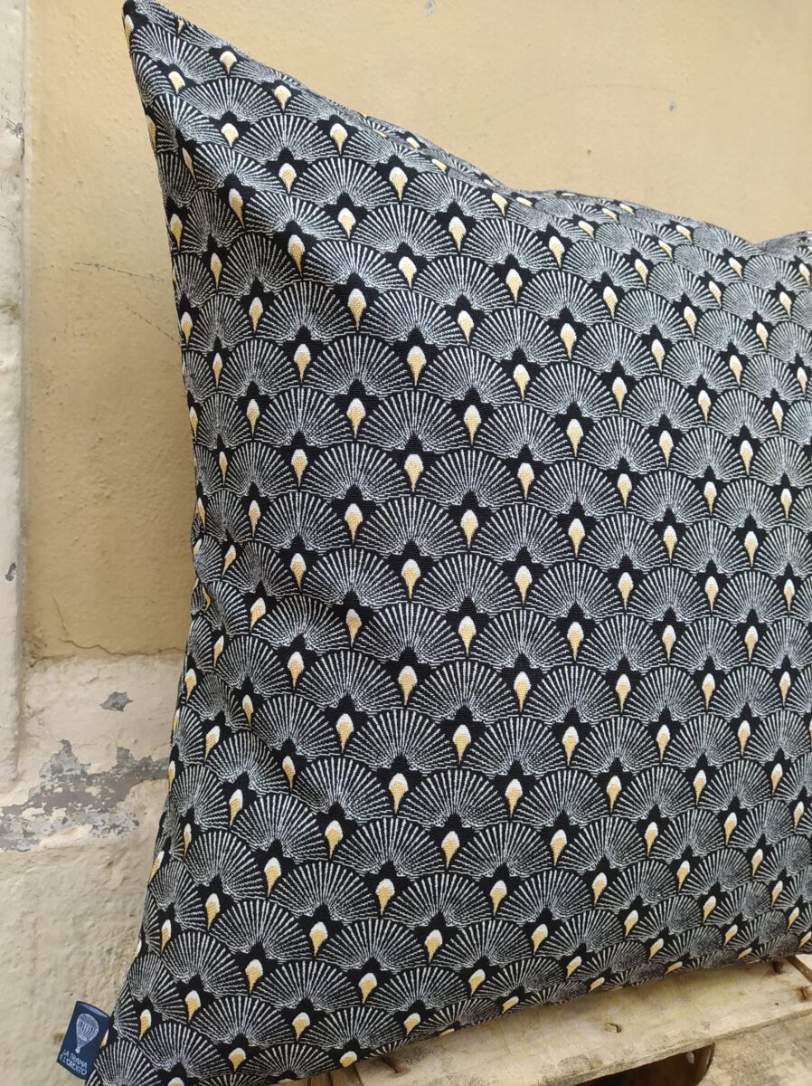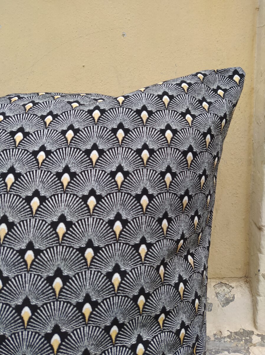 Federa Copricuscino Ventagli Nero e Oro – Questo jacquard double face si coordina perfettamente con tutta la linea della collezione nero/oro. Un pattern moderno per suoi i colori molto definiti che si inserisce perfettamente anche in arredamenti stile inizio ’900.