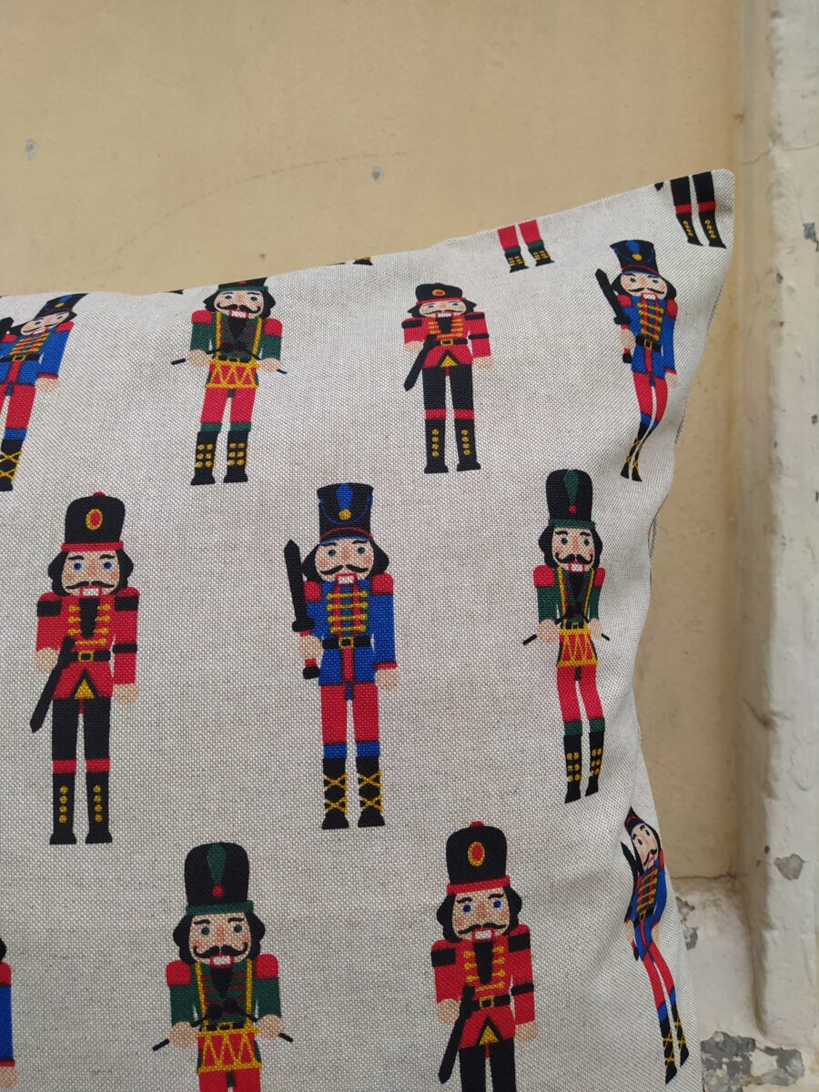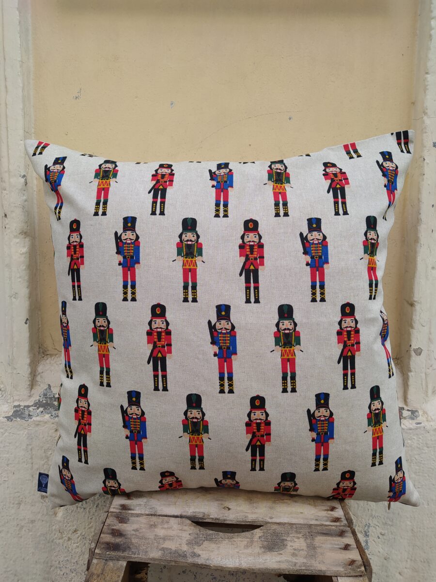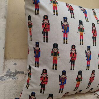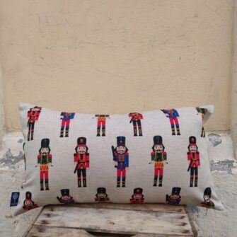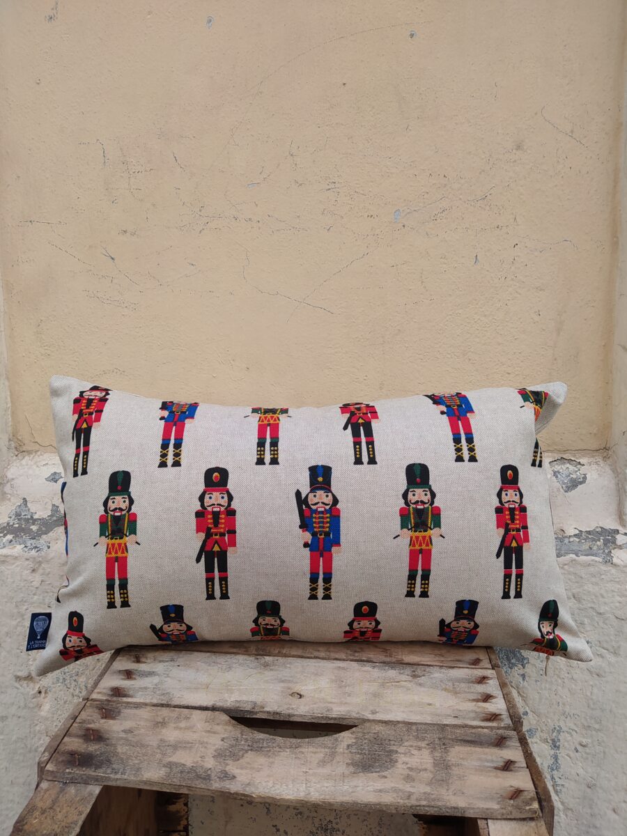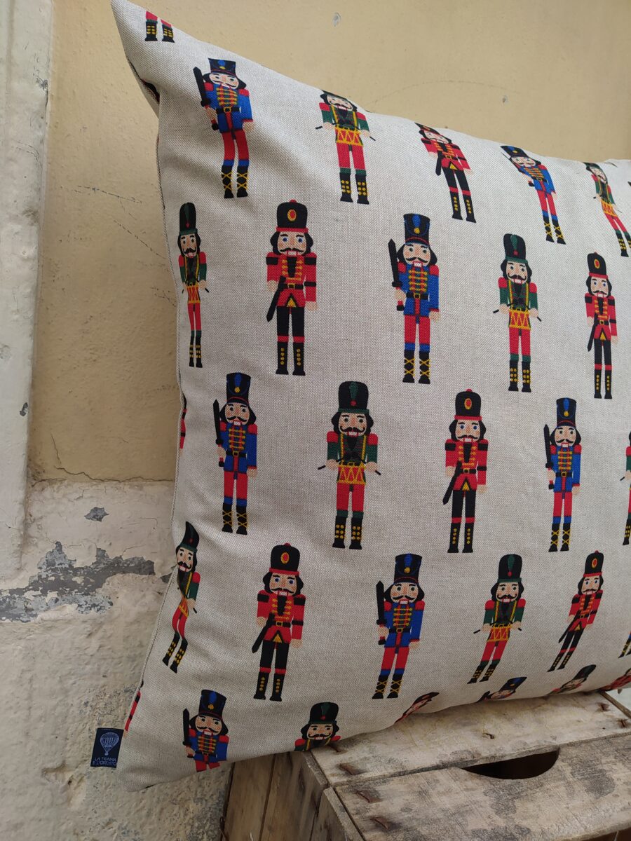 Federa Copricuscino Soldatini Schiaccianoci – Lo schiaccianoci è il soldatino di legno più famoso al mondo, ed è uno degli ornamenti più richiesti regalati da sempre. Abbiamo scelto questo disegno stampato su tessuto in panama misto cotone, così classico, perché un soldatino schiaccianoci non può mai mancare nella camera di un bambino né puoi farne a meno nelle tue decorazioni natalizie.