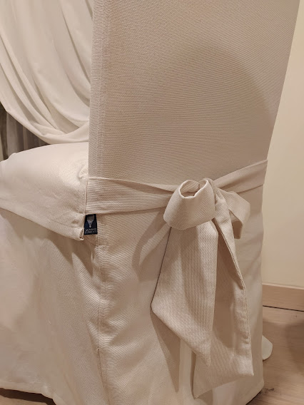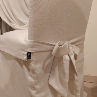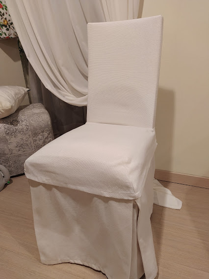 Successivamente abbiamo confezionato vestine lunghe su misura, studiate per valorizzare la linea della sedia e donare un aspetto più elegante alla sala da pranzo. La vestibilità segue le proporzioni reali della struttura e cade in modo armonioso.