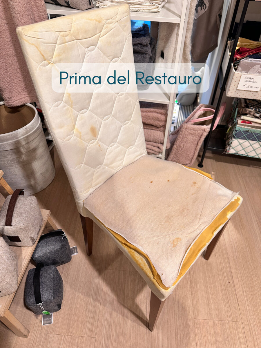 La fodera per sedia con copri seduta coordinato rappresenta una soluzione completa quando le sedie risultano molto vissute e necessitano di un vero recupero. In questo caso le sedie da pranzo erano usurate sia nella struttura sia nelle imbottiture. L’aspetto generale appariva stanco e poco curato.
