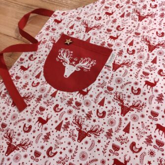 Il grembiule in cotone stampato Cervi Rossi porta nella cucina un carattere unico: la magia dei paesaggi invernali nei cervi natalizi.