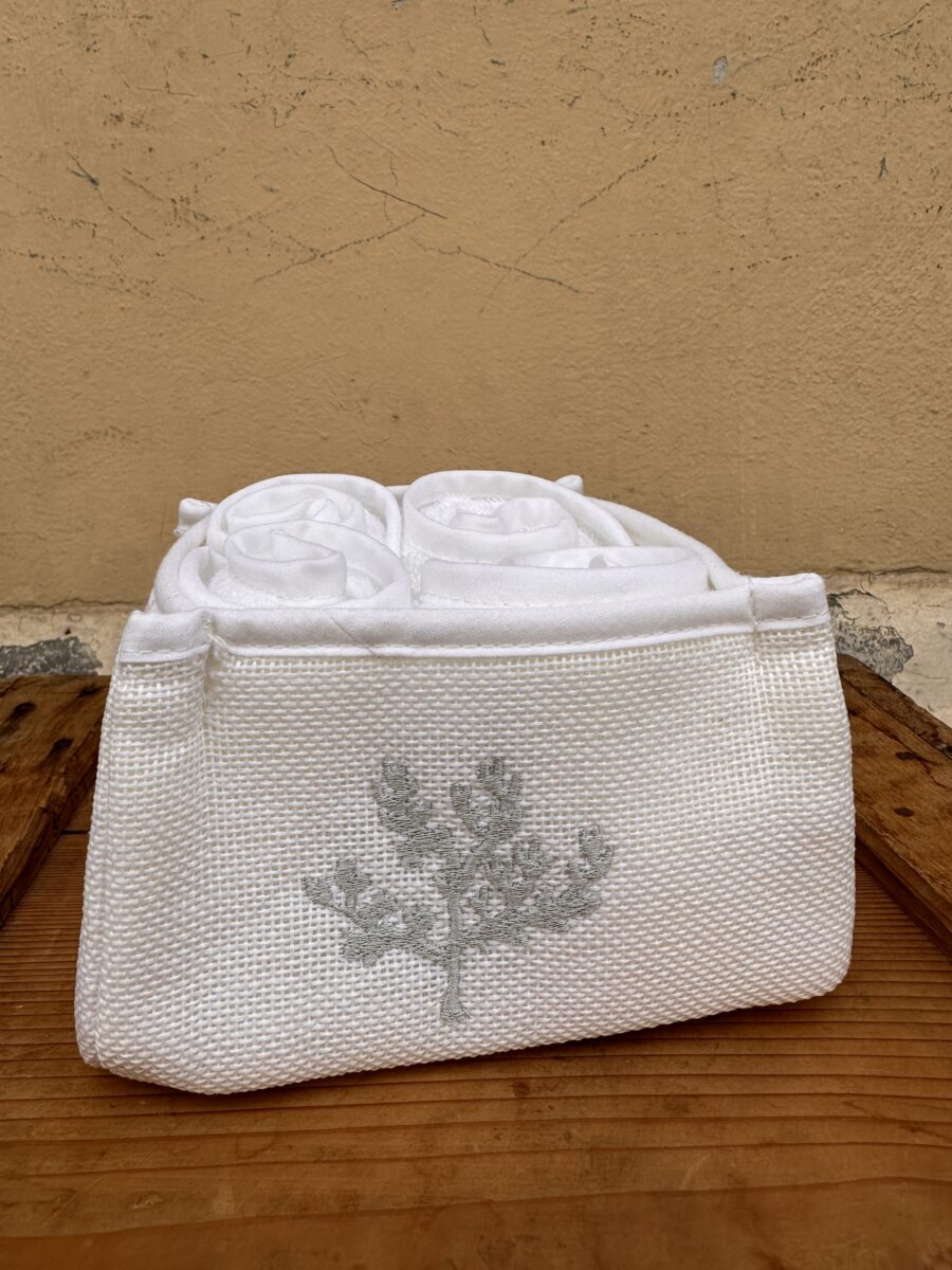 Il cestino bianco, incluso nel set, è ricamato con un elegante motivo di corallo, aggiungendo un tocco di raffinatezza al tuo ambiente. Questo dettaglio ricamato non solo arricchisce il design del set, ma lo rende anche un elemento decorativo che si adatta facilmente a diversi stili di arredamento, dal più moderno al più tradizionale. Il colore bianco del cestino offre un coordinato elegante con il colore delle lavette, creando un look armonioso e sofisticato.