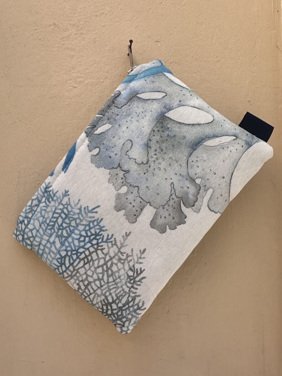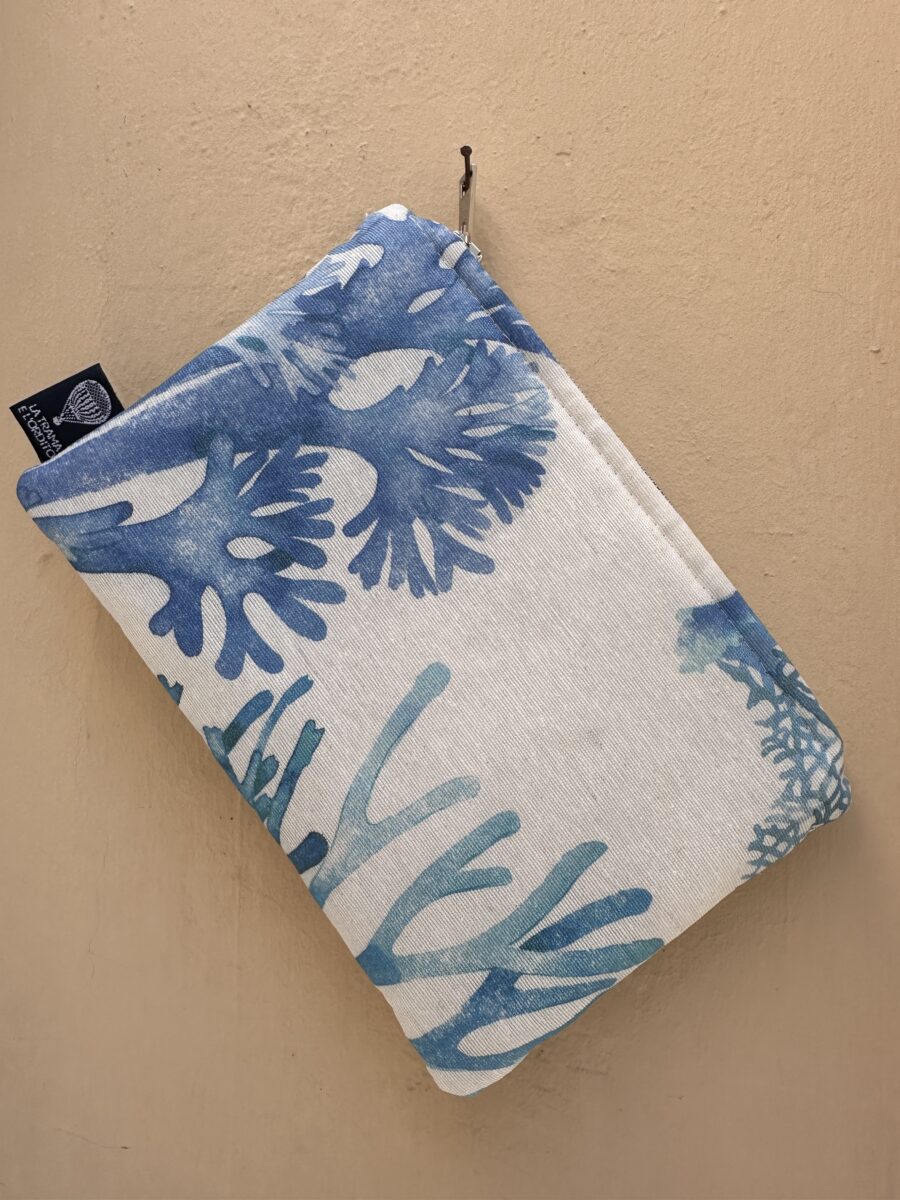 Ogni pochette nasce nei laboratori sartoriali di Brescia, dove ogni dettaglio viene curato con attenzione. La fodera interna in tessuto neutro coordinato, la leggera imbottitura e la cerniera decorativa creano un insieme armonioso di funzionalità e raffinatezza. Le tonalità del blu e dell’azzurro si mescolano a motivi corallini che evocano il fondale marino, rendendo ogni pezzo unico e inconfondibile.