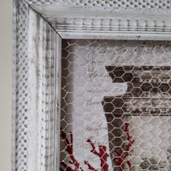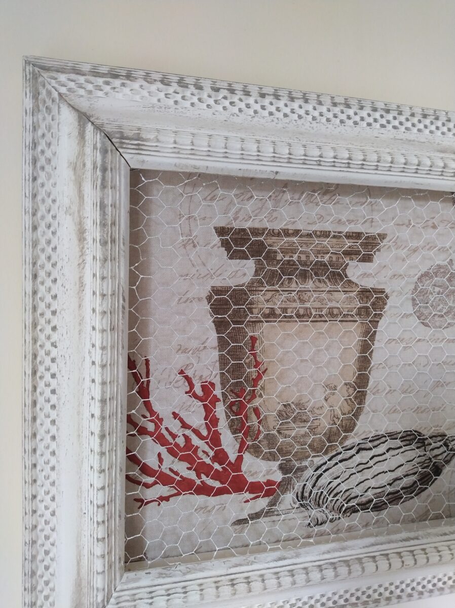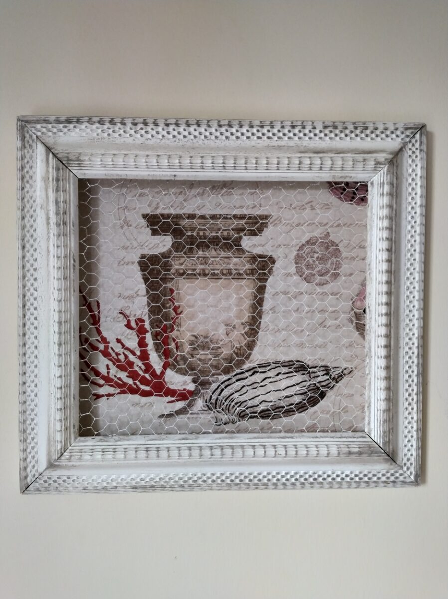 Un complemento d’arredo che farà felice chi ama lo stile Shabby-Chic. Realizzato con uno dei nostri tessuti della collezione “Mare”, ha una cornice in legno lavorato con una splendida finitura decapata. La rete in metallo è stata dipinta dello stesso colore e fa le veci del vetro, rendendo una bella profondità al quadro. Il soggetto è la riproduzione di una vecchia anfora con conchiglia e corallo rosso, stampata su un fondo in panama naturale, su cui si intravedono scritte e segni grafici.
