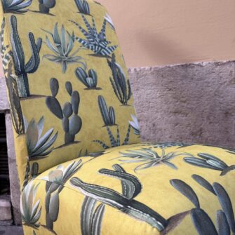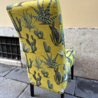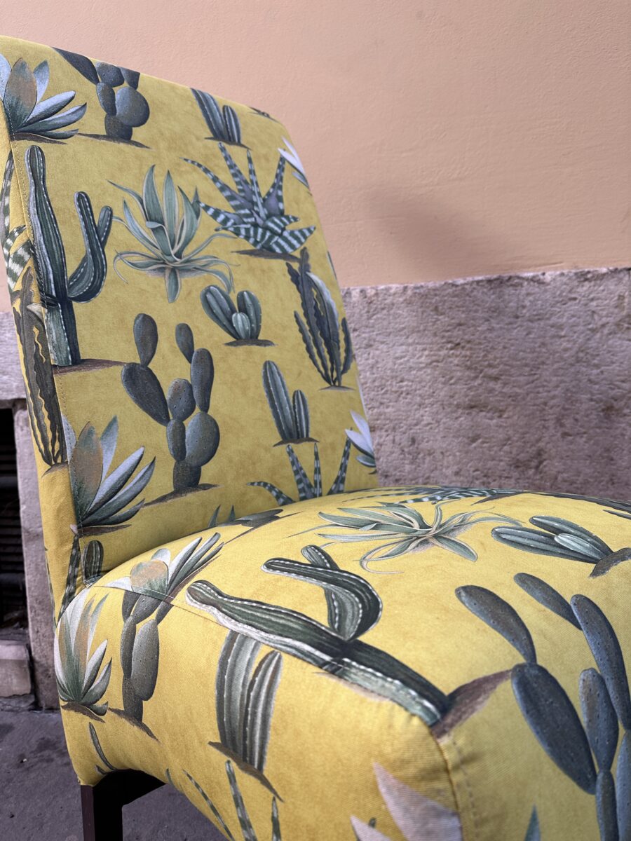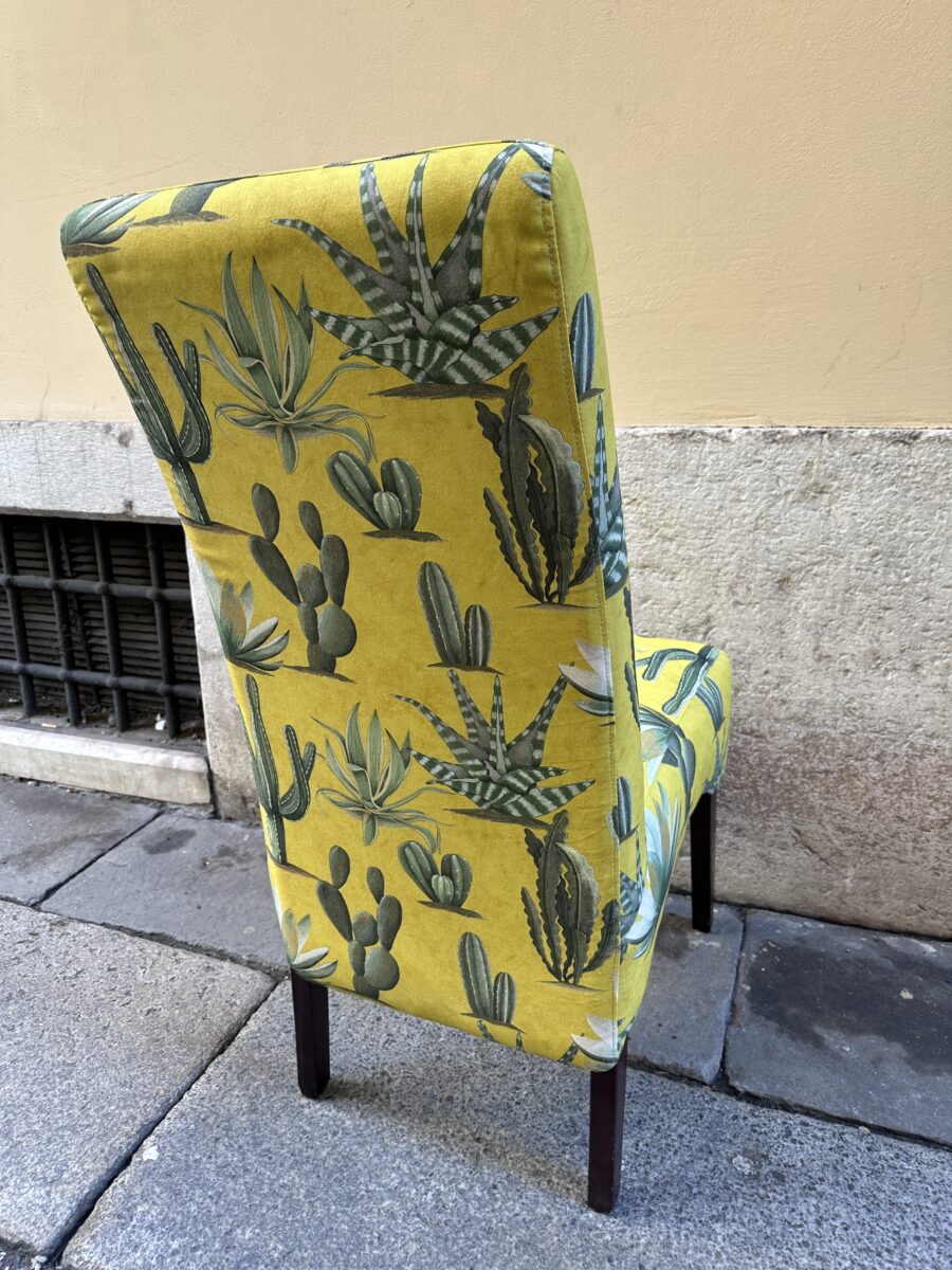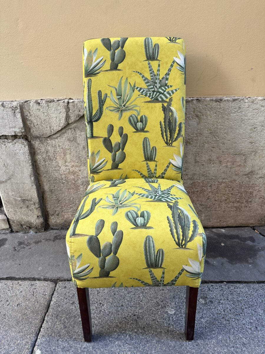 Abbiamo deciso di intervenire in modo deciso. Dopo aver verificato e sistemato la seduta, abbiamo rivestito completamente la sedia con il tessuto Cactus Mexico. Il disegno vivace, con le sue tonalità intense e il fondo luminoso, ha dato immediatamente carattere alla struttura.