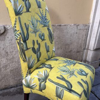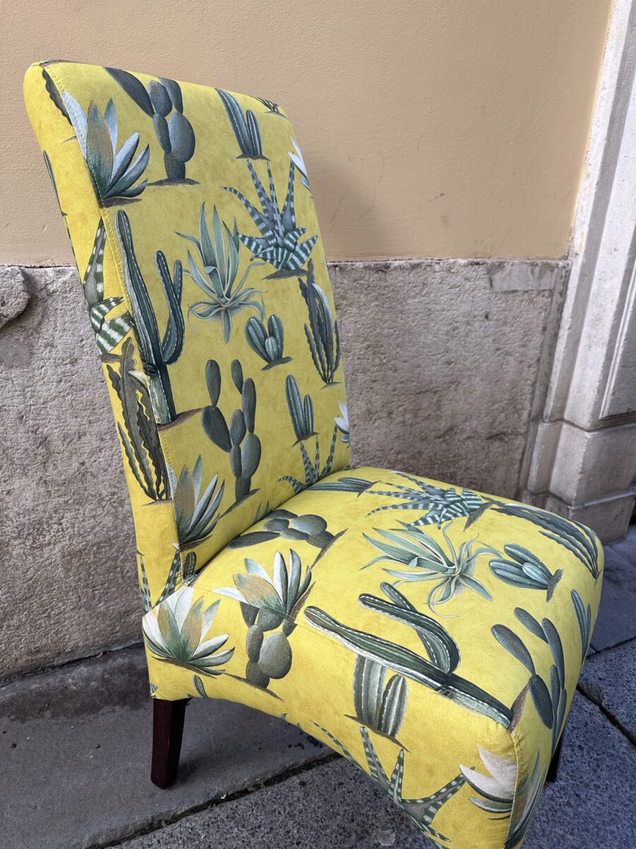 Questo rivestimento sedia imbottita non rappresenta un prodotto in vendita, ma è un esempio concreto di come una sedia datata possa uscire dall’anonimato grazie a una scelta tessile coraggiosa e a una lavorazione artigianale accurata.