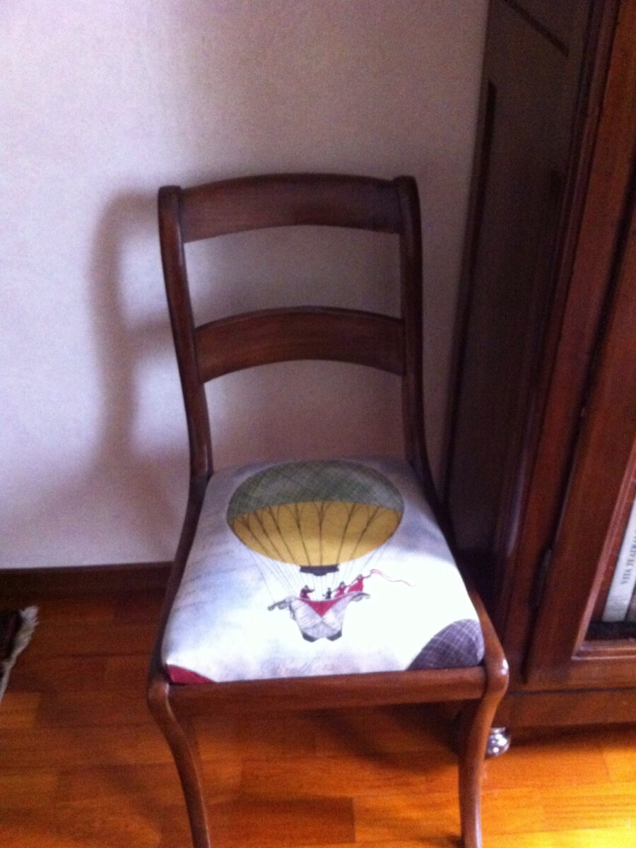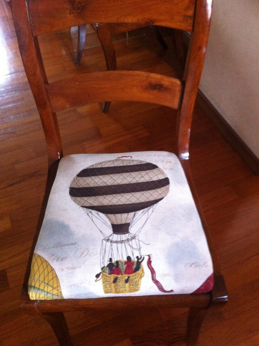 Per questo progetto abbiamo scelto il tessuto Mongolfiere Colorate, disponibile in collezione. È uno dei nostri disegni più riconoscibili e amati. Il bello di questa fantasia è che ogni seduta può essere personalizzata. Ogni sedia può mostrare una mongolfiera diversa, creando un insieme coordinato ma mai identico.