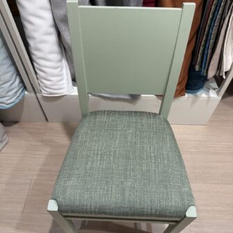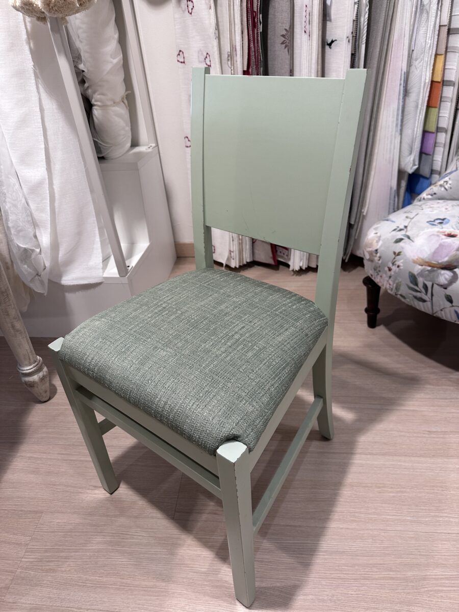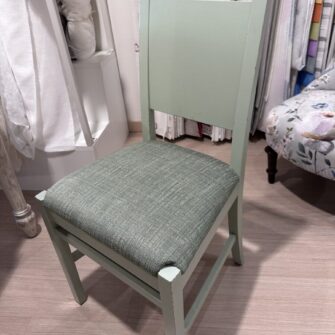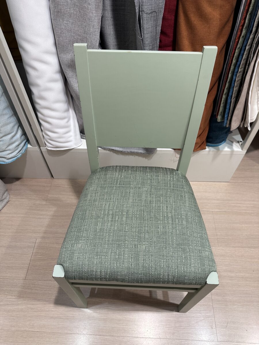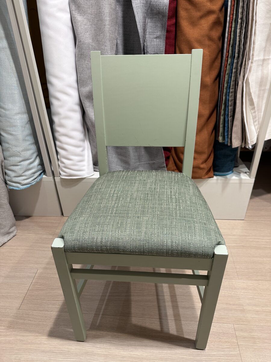 La scelta dell’unito crea un elegante effetto total look. Il verde salvia dialoga con la struttura della sedia e dona equilibrio, sobrietà e raffinatezza. Ora queste sedie hanno acquisito una dignità nuova, perfettamente adatta a una sala da pranzo elegante.