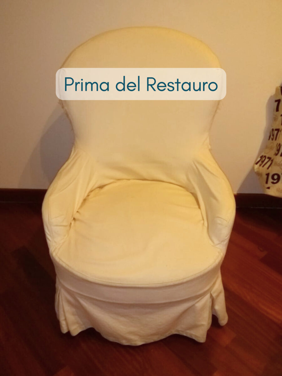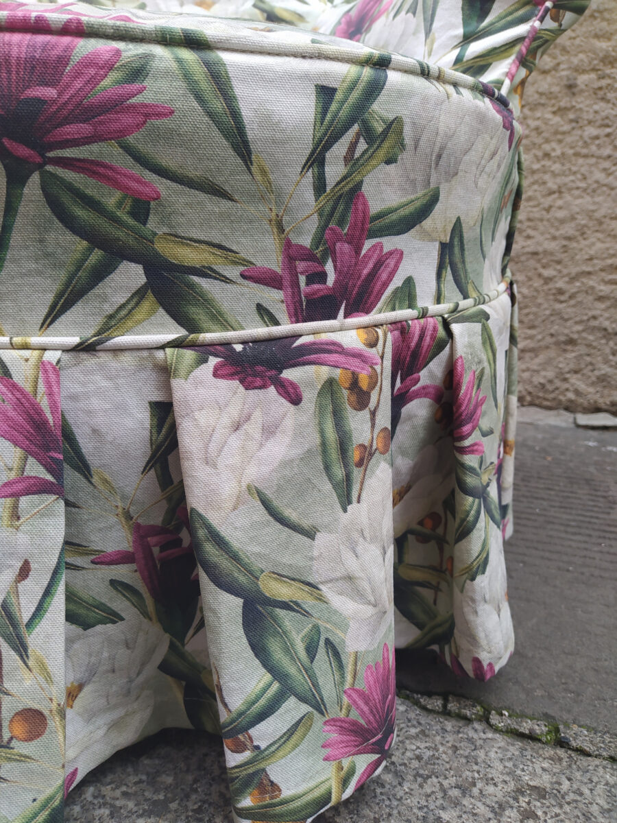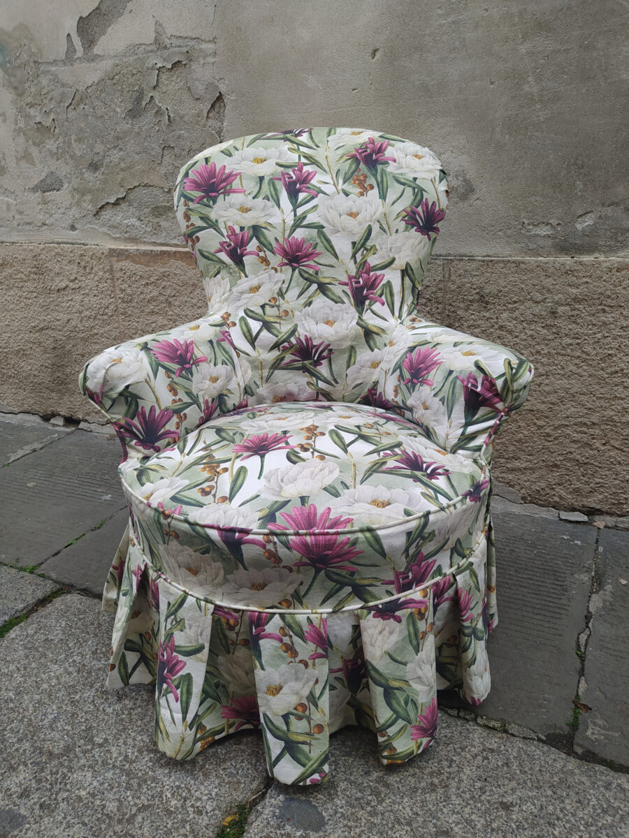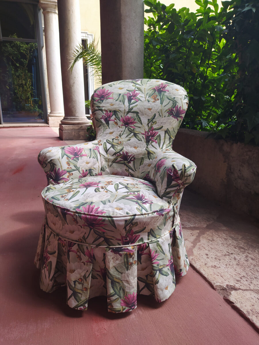 Per rendere la poltroncina ancora più romantica abbiamo aggiunto una gonnellina a pieghe che copre le zampe. Questo dettaglio cambia completamente la percezione dell’arredo. La base risulta più morbida, più elegante, più coerente con uno stile classico rivisitato. Inoltre la gonnellina consente di nascondere eventuali imperfezioni della struttura originale, valorizzando l’insieme.
