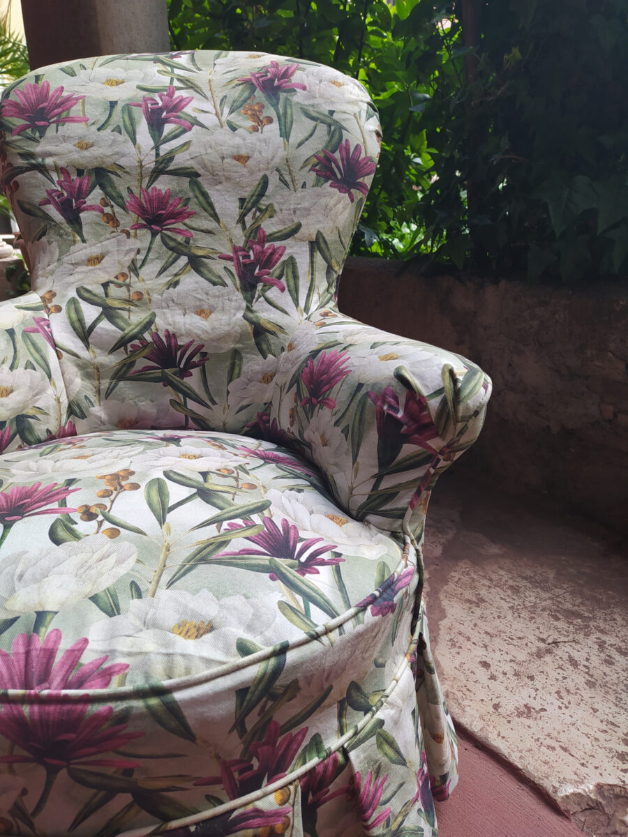 Il rivestimento sfoderabile per poltrona nonnina permette di trasformare una seduta classica in un complemento romantico e attuale. In questo progetto abbiamo scelto il tessuto Fiori Begonia, disponibile in collezione, per valorizzare le linee morbide di questa piccola poltrona da camera.