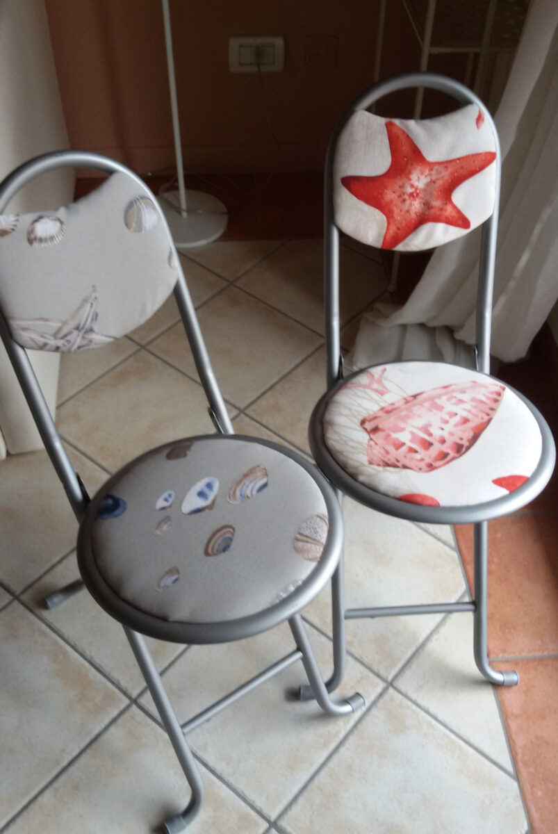 Questo rivestimento per sgabelli pieghevoli non rappresenta un prodotto in vendita, ma è un esempio concreto di come anche una seduta secondaria possa diventare parte integrante dell’arredo, senza restare un semplice “pezzo di servizio”.