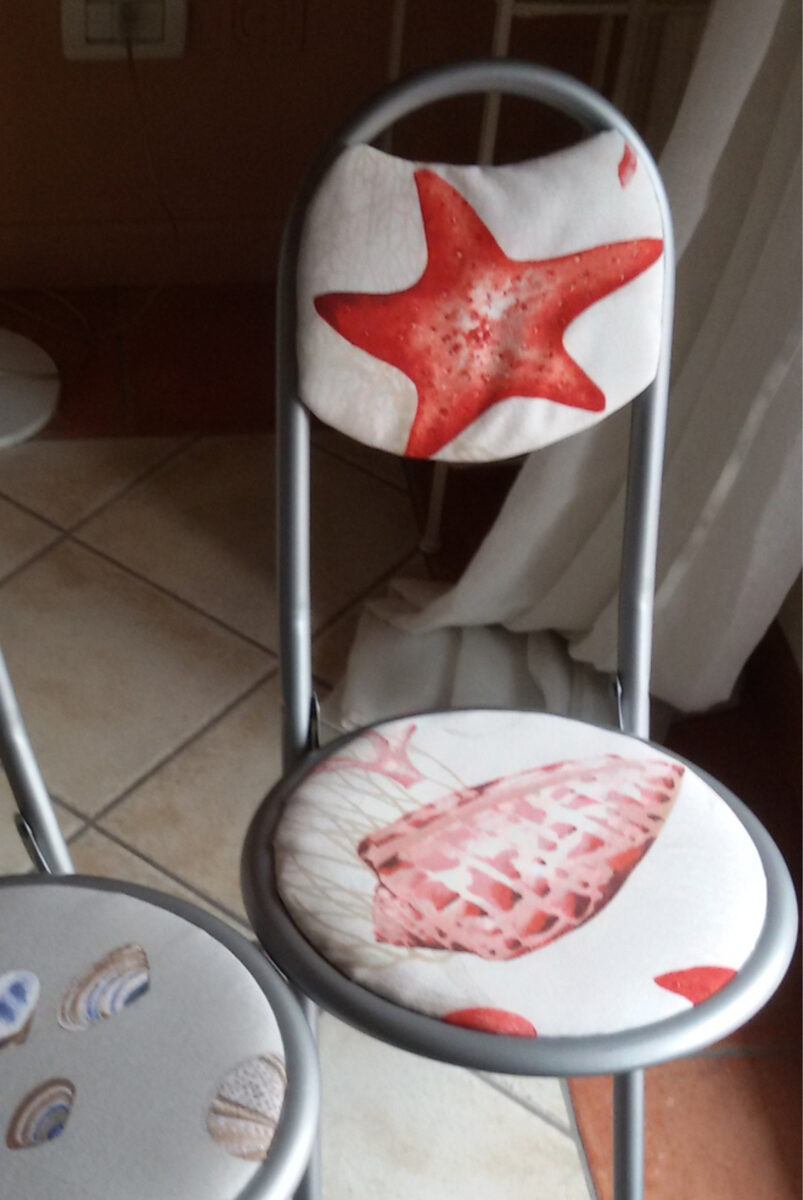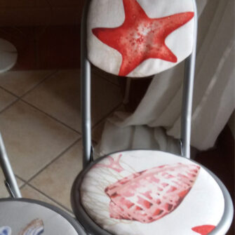 Abbiamo scelto tessuti a tema mare, freschi e luminosi, capaci di evocare immediatamente un’atmosfera estiva e rilassata. Conchiglie, stelle marine e dettagli marini hanno trasformato questi semplici sgabelli in piccoli elementi decorativi coerenti con l’ambiente.