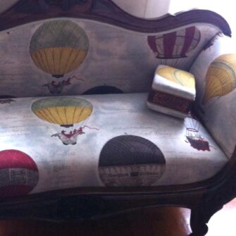 Per il rivestimento abbiamo scelto il tessuto Mongolfiere Colorate, attualmente disponibile e uno dei nostri best seller. È un motivo iconico per il nostro negozio, tanto da aver ispirato anche il nostro logo. La grafica vivace ma equilibrata dialoga con la struttura in legno e dona al divano personalità e riconoscibilità.