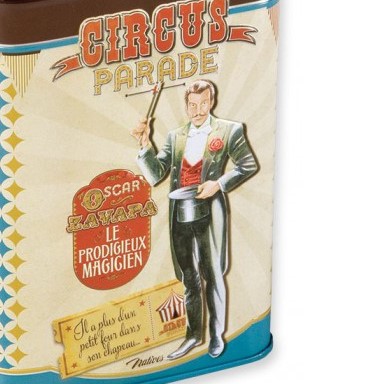 Scatola in metallo “Circus Parade” in stile vintage. Puoi scegliere tra diverse misure per una cucina allegra, sempre in ordine e ben organizzata. Su ogni scatola è presente un piccolo riquadro lavagnetta su cui scrivere il nome del cibo conservato. Ma puoi utilizzarle anche per riporre piccoli oggetti o per tenere il necessaire da cucito a portata di mano. È senz’altro una fantastica idea regalo per gli amanti dello stile Vintage.