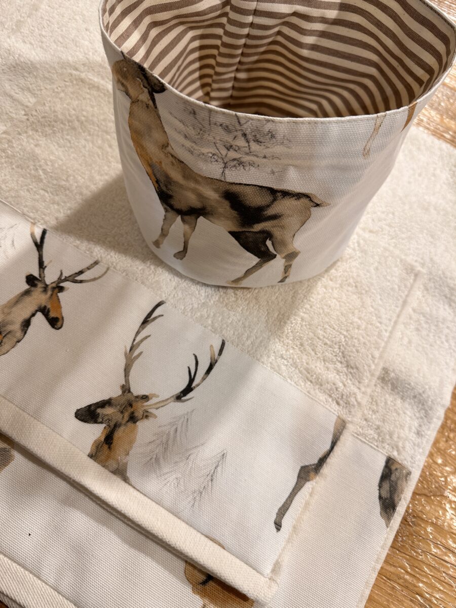 un cestino double face in puro cotone, ideale per organizzare creme, profumi, lavette o piccoli accessori. Puoi scegliere ogni giorno quale lato esporre: la fantasia con cervi e sfumature naturali o la tinta unita, per un effetto più sobrio.
