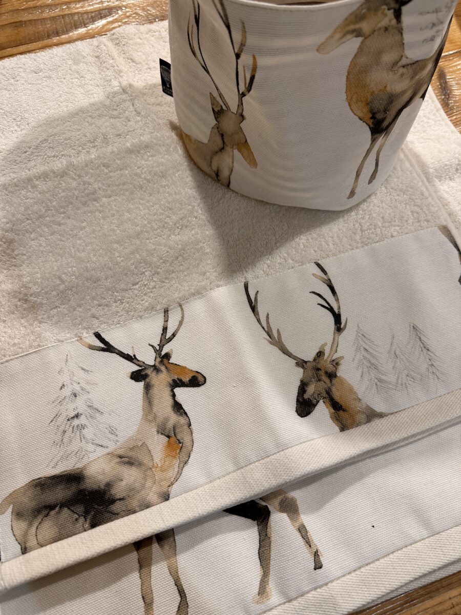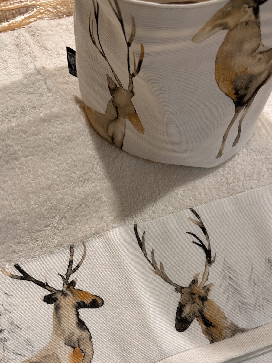 Il Set Bagno Cervi Acquerello è pensato per portare armonia e delicatezza nella stanza da bagno. Le tonalità morbide del tessuto, ispirate ai cervi dipinti ad acquerello, evocano la calma della natura e i colori dei boschi, rendendo l’ambiente più accogliente e raffinato. 🦌
