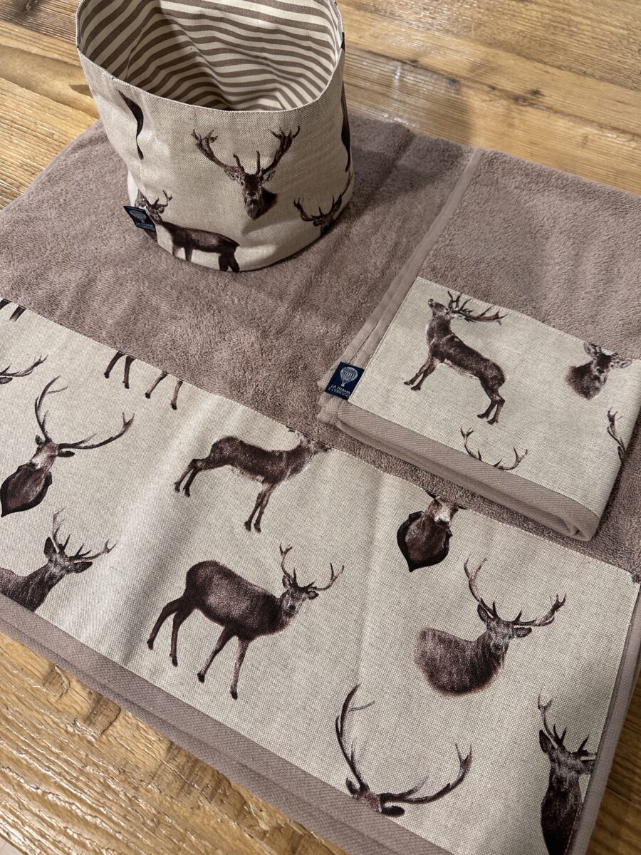 Puoi acquistare il set completo o scegliere i singoli prodotti cliccando sui link: Coppia Asciugamani Cervi Brown, Cestino Double Face Cervi Brown.