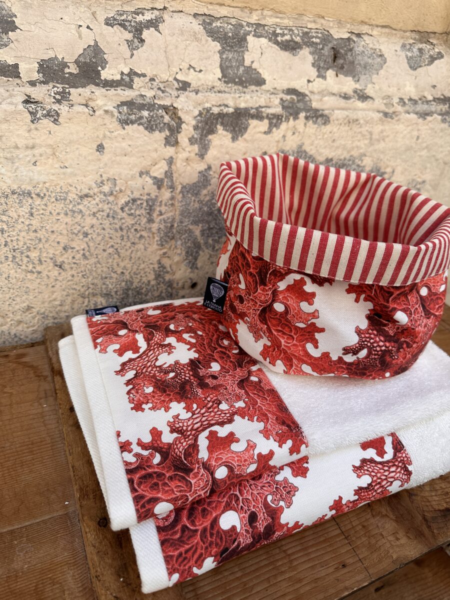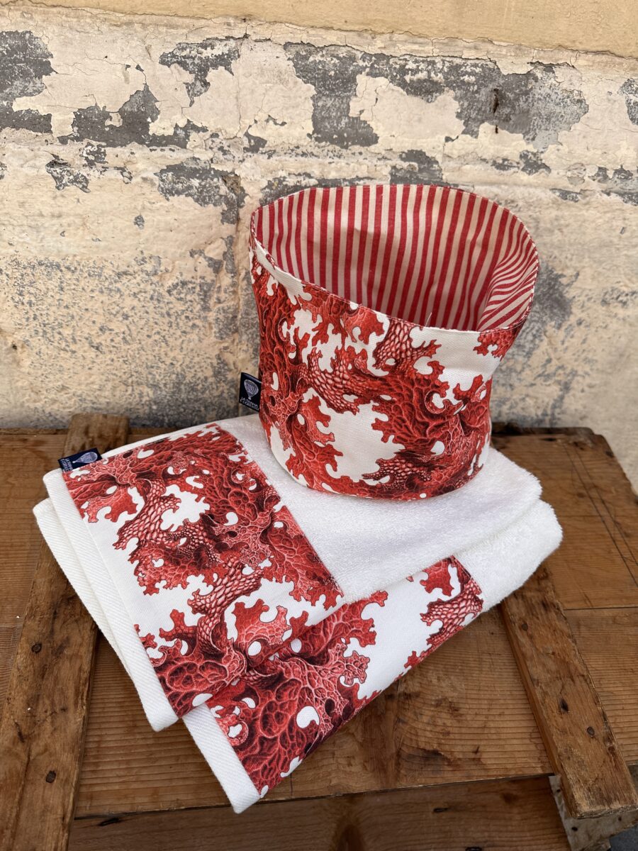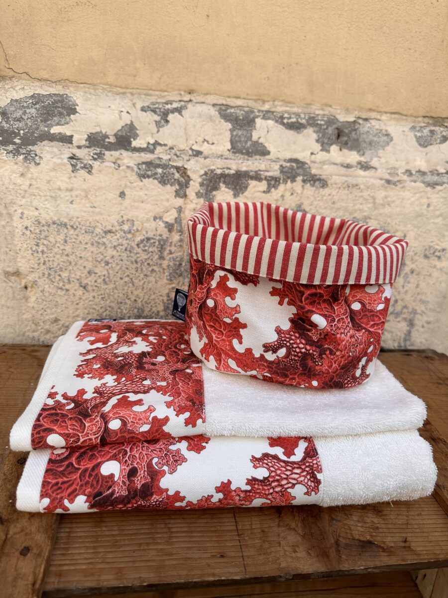 Puoi acquistare il set completo o scegliere i singoli articoli cliccando sui link: Coppia Asciugamani Coralli Rossi, Cestino Double Face Coralli Rossi.