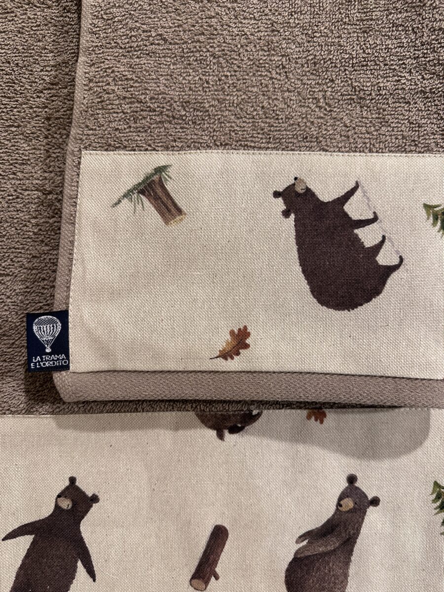 Il Set Bagno Orsi è lavabile e progettato per conservare colori e morbidezza anche dopo numerosi lavaggi. L’etichetta con il logo Trama e Ordito Tessuti certifica autenticità e produzione 100% italiana. Ogni set è unico, con piccole variazioni nella disposizione dei soggetti sul tessuto, rendendo ogni pezzo irripetibile e originale.