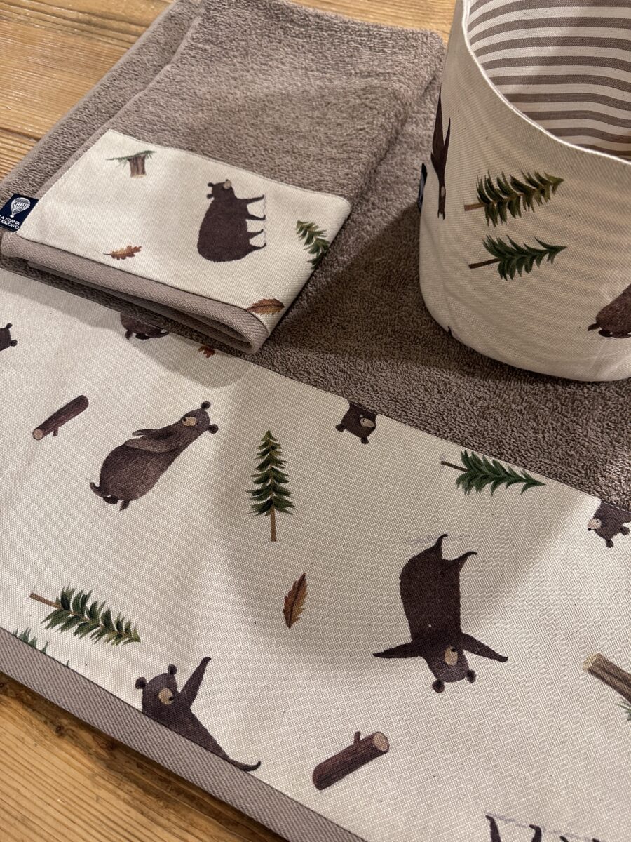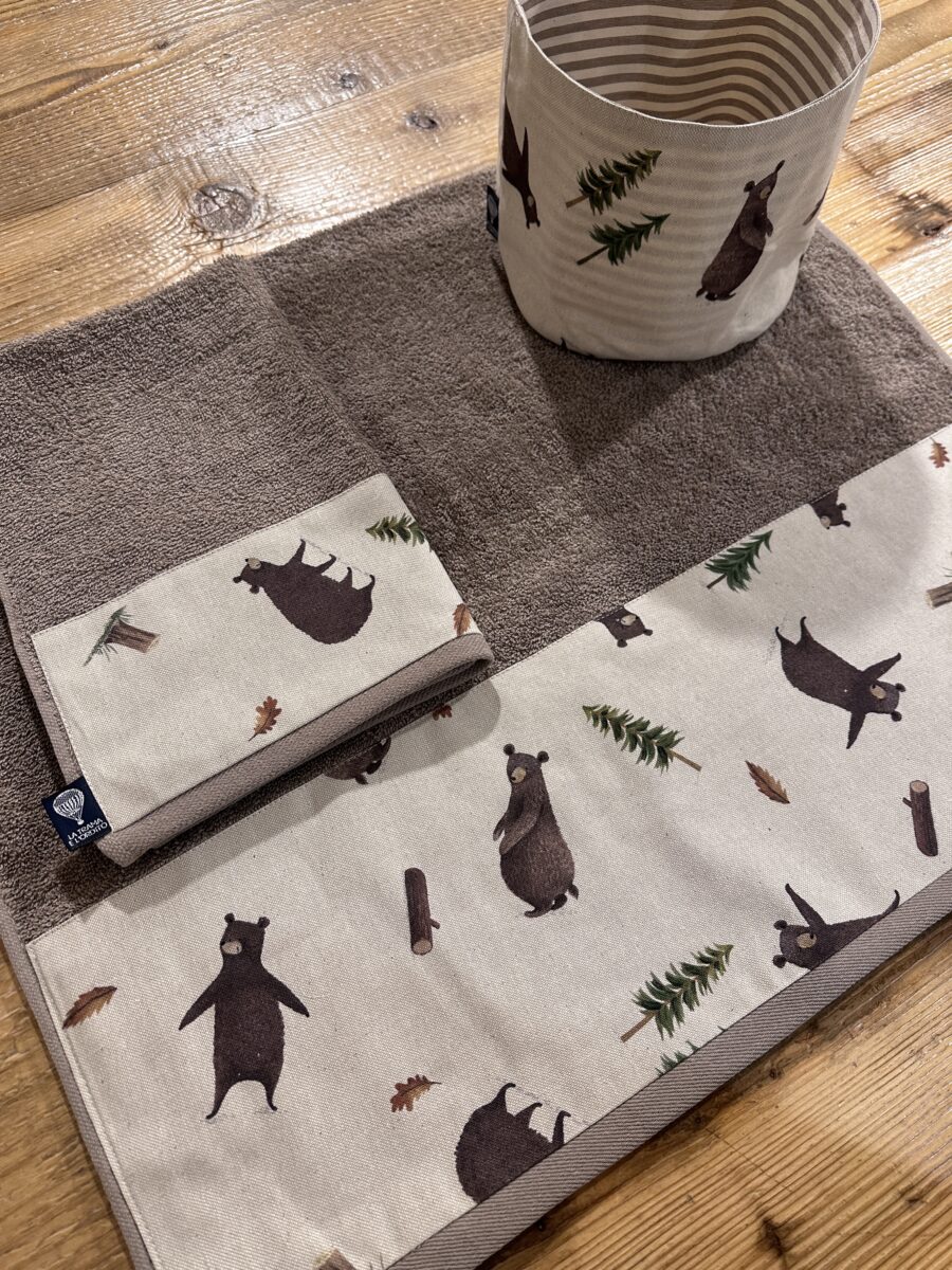 Il Set Bagno Orsi unisce morbidezza e calore, trasformando il bagno in un angolo accogliente e rilassante. La fantasia con orsi stilizzati e dettagli ispirati alla montagna crea un’atmosfera familiare, perfetta per le case di campagna, i rifugi o gli ambienti che amano il contatto con la natura. 🐻