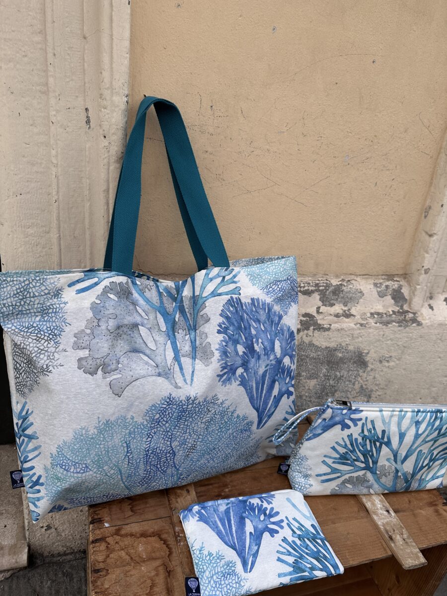 La Collezione Corallo Azzurro richiama l’eleganza dei fondali marini con i suoi colori freschi e vibranti. Abbiamo creato un set borsa impermeabile pochette beauty case Corallo Azzurro, pratico e raffinato, utilizzando puro cotone resinato impermeabile, resistente e di alta qualità.