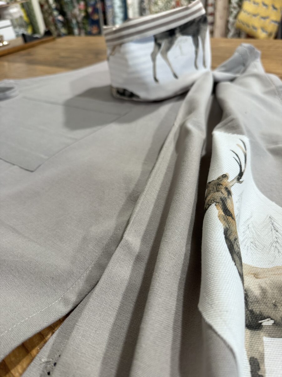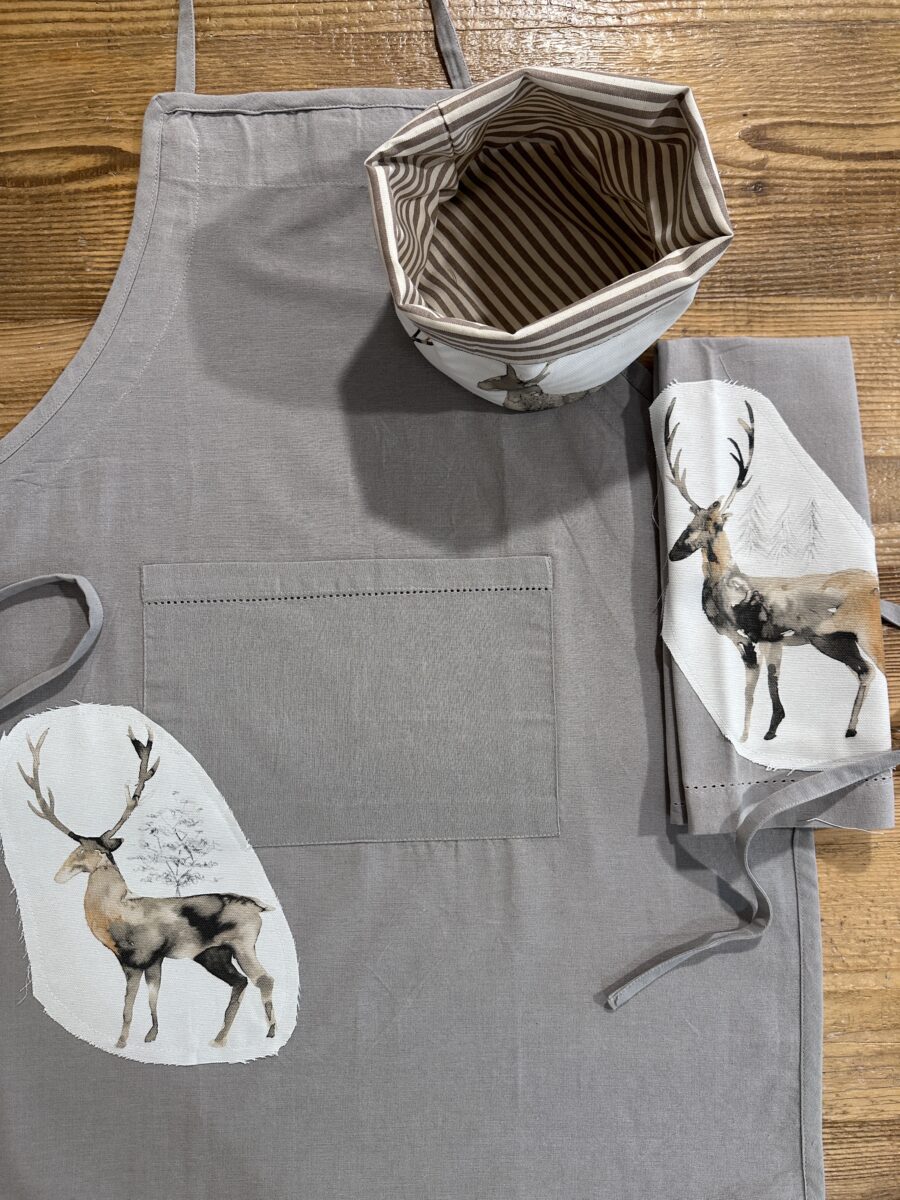 un grembiule in cotone tinta unita, con orlo a giorno e tasca frontale, decorato con applicazioni in tessuto Cervi Acquerello dai tratti morbidi e sfumati;